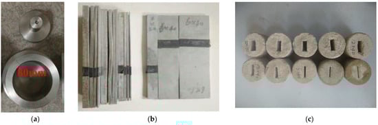 The materials required are rapid-setting, high-strength cement; coarse sand; hydraulic oil; and water. The main tools required are specimen preparation molds; prefabricated fracture molds; a vibrator; a rubber hammer; and sandpaper, as shown in Figure 4a,b.