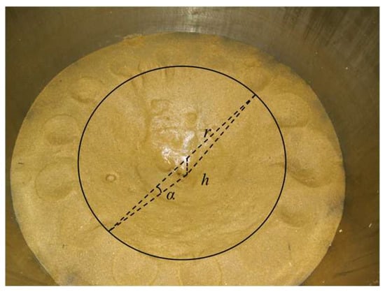 The morphology of the collapse funnel in water and sand inrush is characterized by three parameters: the funnel central depth (h), the funnel top radius (r), and the average measured funnel slope angle (α) (see Figure 5). Nevertheless, there are two limitations in the test: first, due to the size of the chamber, the top radius of the funnel cannot continue to expand once it reaches the chamber wall; second, the heterogeneity of the sand interferes with observations.