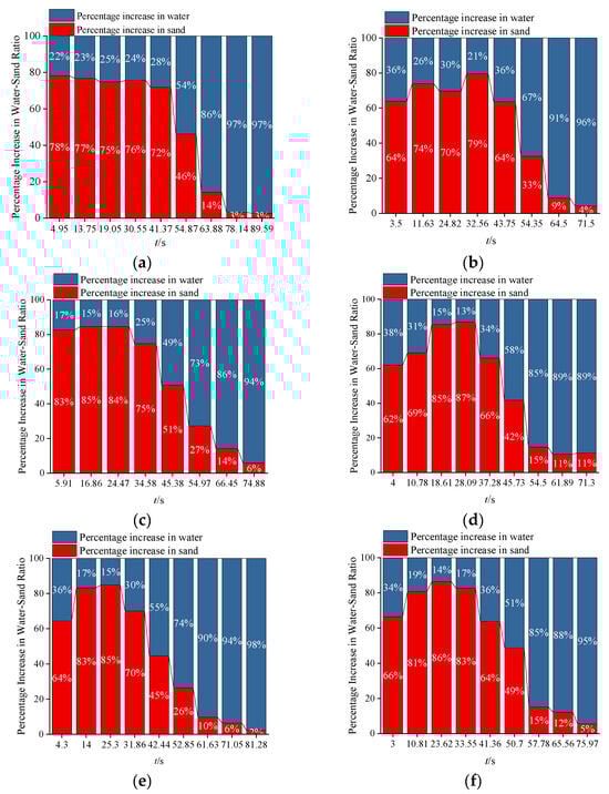 Percentage increase in water and sand mass for different fracture widths: (a) 6 mm; (b) 8 mm; (c) 10 mm; (d) 12 mm; (e) 14 mm; (f) 16 mm.