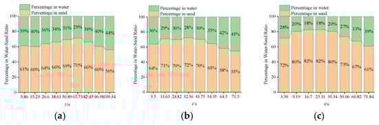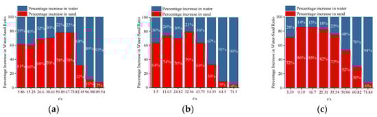 Percentage content in water and sand mass for different sand particle size components: (a) Fine-grained sand; (b) Medium sand; (c) Coarse sand.