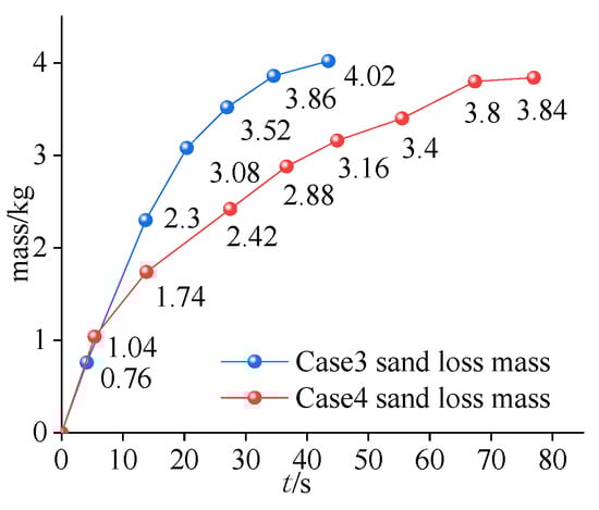 The differences are mainly reflected in: (1) The stable sand loss duration of fine-grained sand (approximately 53 s) is longer than that of medium sand and coarse sand (approximately 28 s), and the sand loss mass of fine-grained sand is significantly greater than that of coarse sand and medium sand, as shown in Figure 12b.