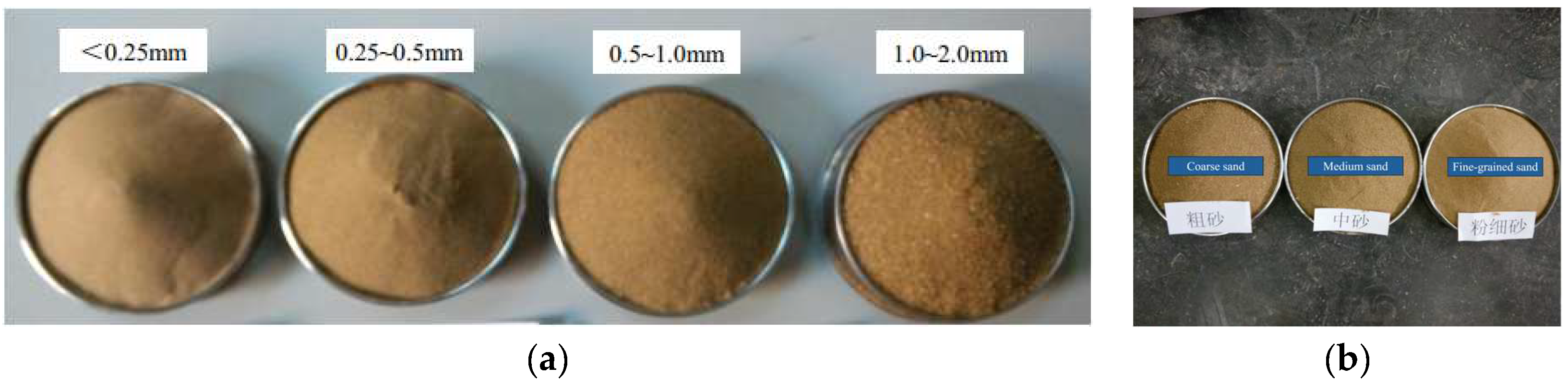 Basic sand samples with three grain size compositions—coarse sand, medium sand, and fine-grained sand—were prepared. Constant test conditions were set, including a fracture opening of 8 mm, an aquifer thickness of 150 mm, a water pressure of 0.03 MPa, and a single vertical fracture.