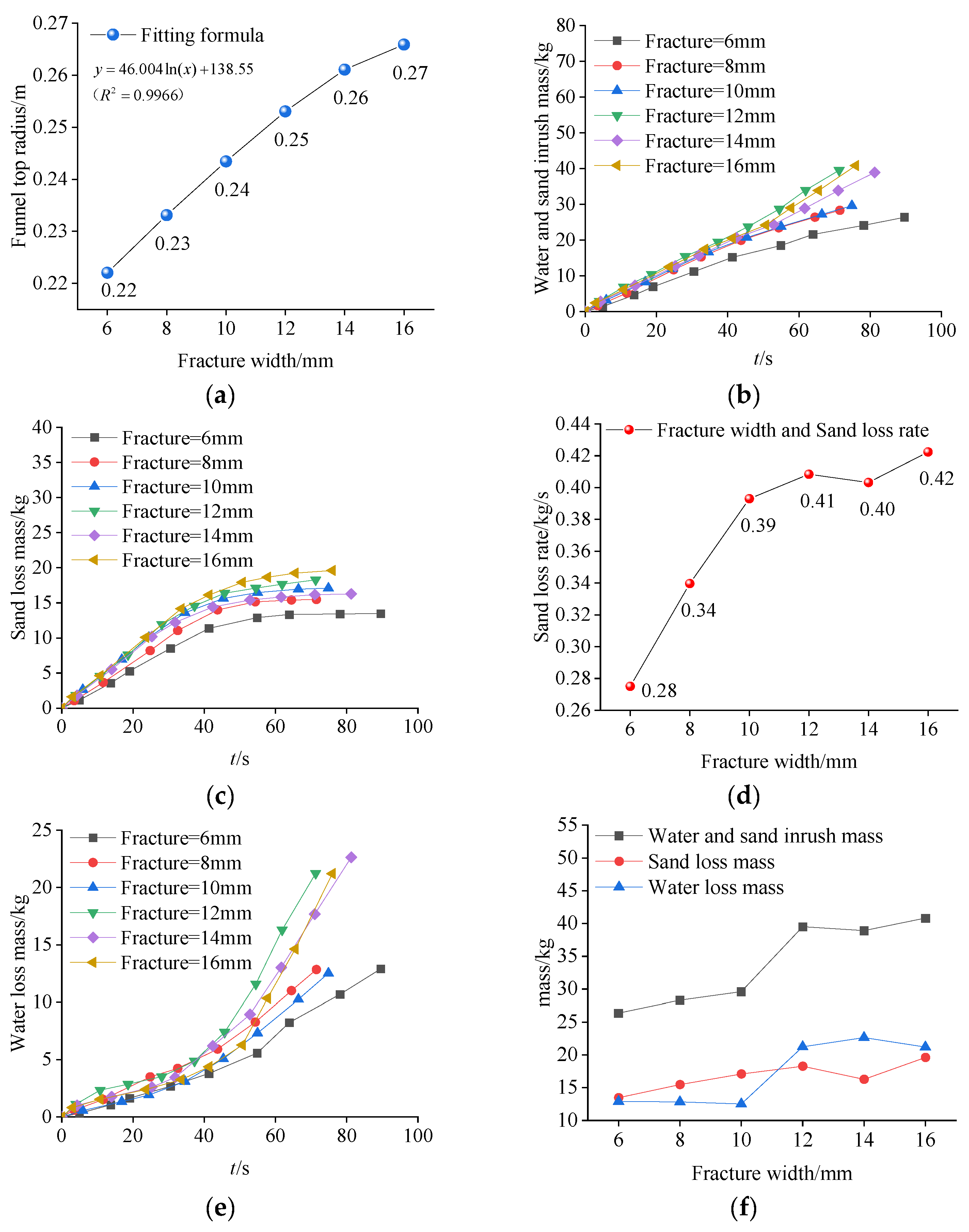 The relationship between fracture width and various parameters: (a) Fracture width and funnel top radius; (b) Different fracture width and water and sand inrush mass; (c) Different fracture width and sand loss mass; (d) Fracture width and sand loss rate; (e) Different fracture width and water loss mass; (f) Fracture width and content.