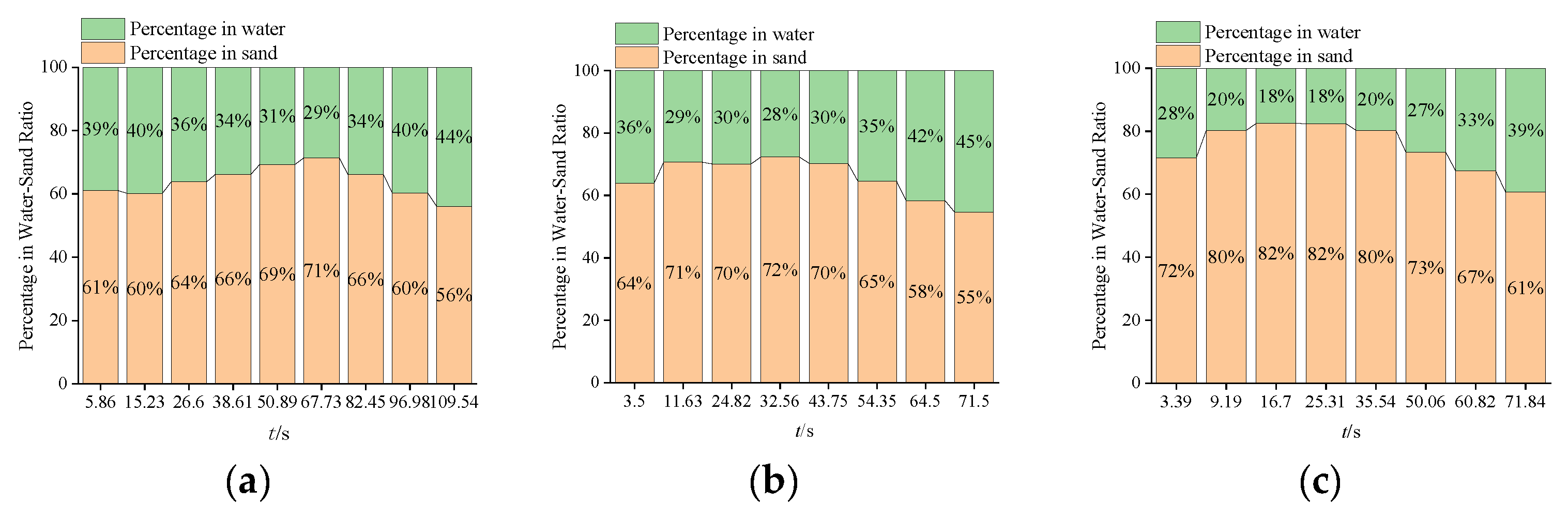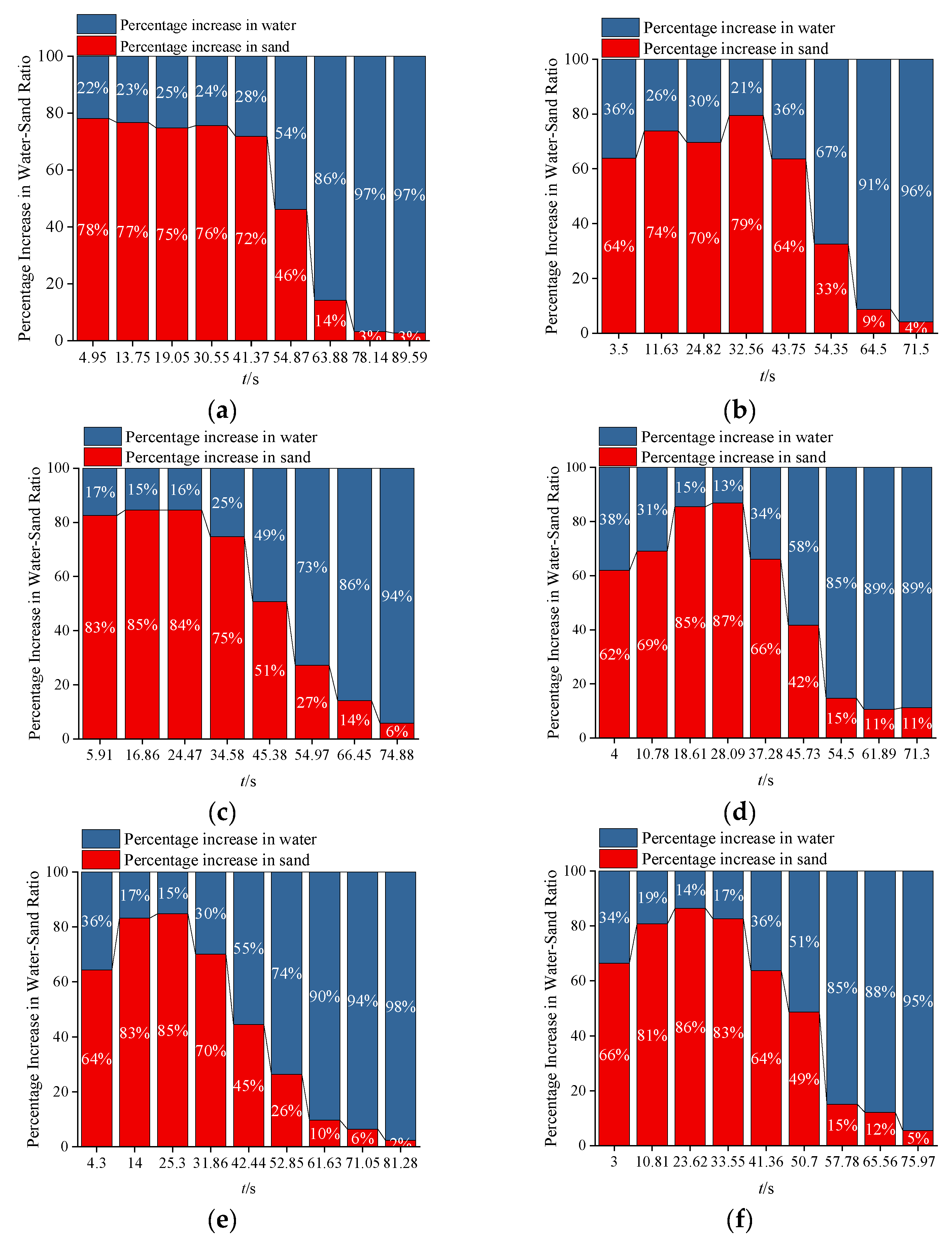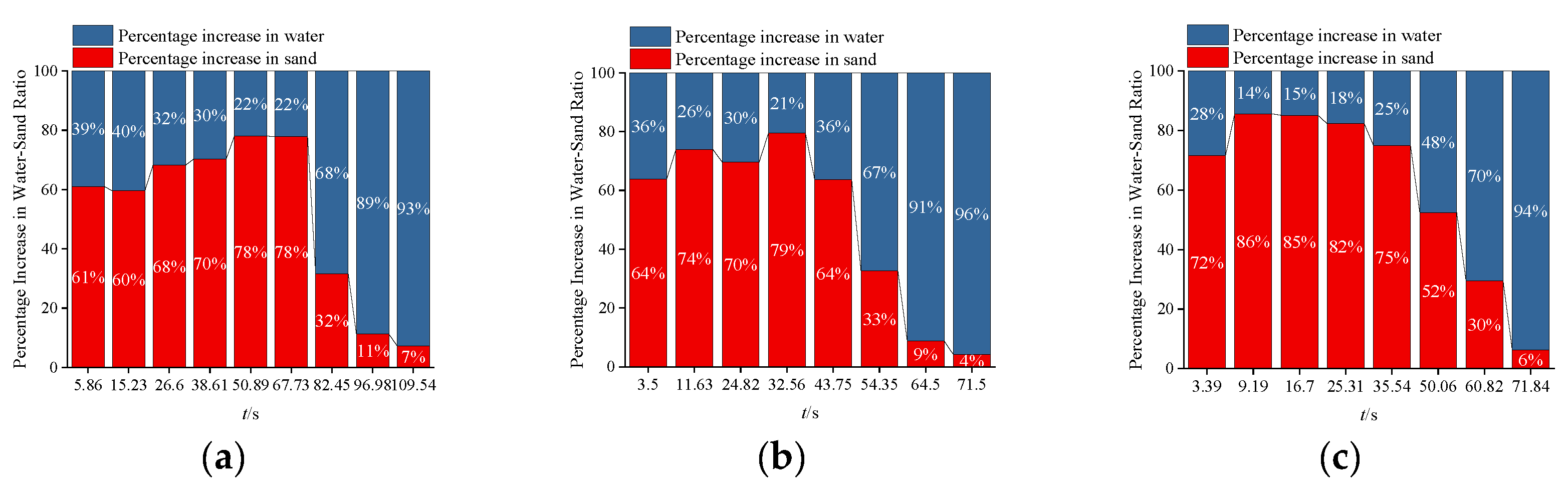 Figure 7d–f), at the initial stage of water and sand inrush, the sand is rapidly flushed out under the combined action of water flow and gravity. This causes the proportion of sand in the water-sand mixture to increase continuously until it reaches a peak (sand accounting for 85–87%), which corresponds to the inflection point of the sand loss mass. After this point, the proportion of the water mass increment rises. Meanwhile, the decrease in sand loss mass increases the available space for water flow in the fracture channel. At this stage, the water loss rate surges sharply; the sufficient water flow carries the sand, causing the sand to collapse both laterally and vertically. This ultimately results in a decrease in the funnel slope angle and an increase in the funnel top radius.