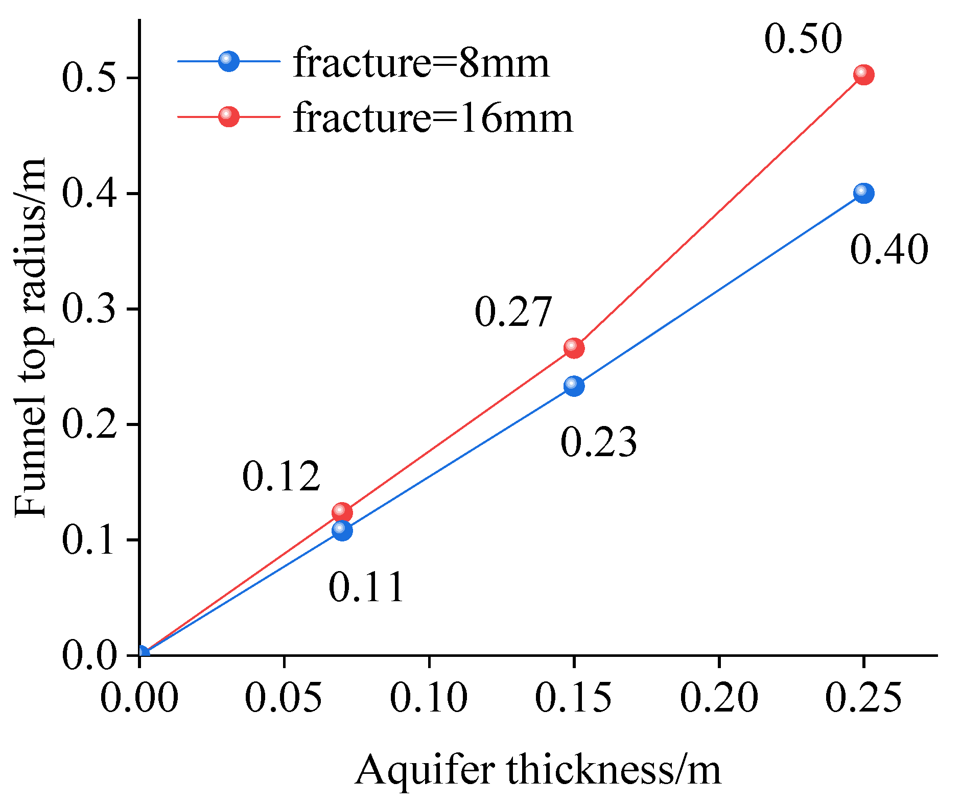 Table 3. Data indicate that as the fracture width increases, the funnel top radius gradually increases—resulting in a larger collapse funnel volume and consequently a greater degree of hazard. However, the magnitude of this increase (in both radius and volume) gradually diminishes as the fracture width increases further.