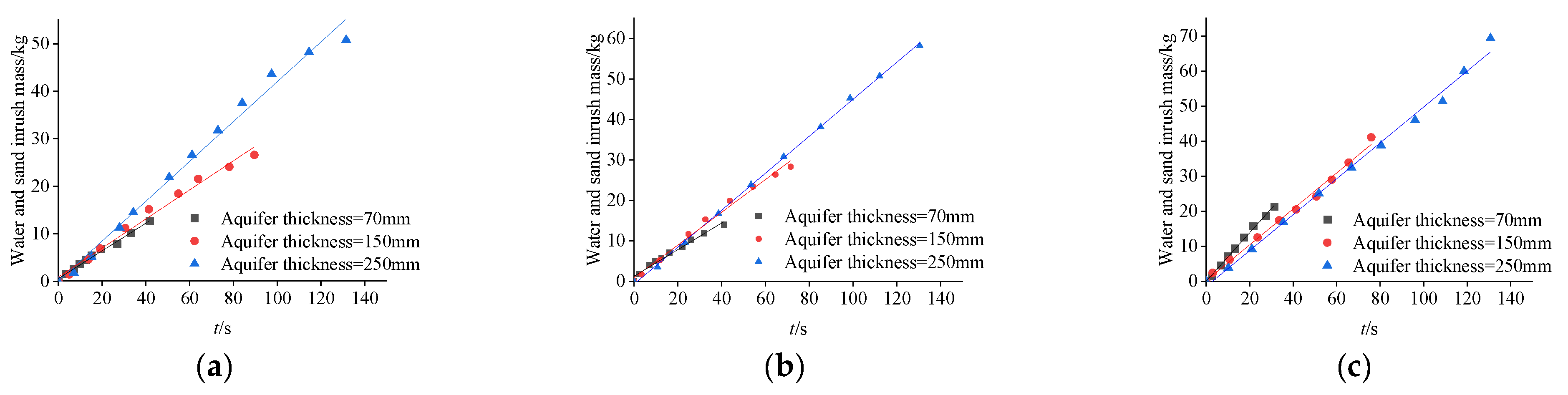 Figure 9, the aquifer thickness has a significant impact on the water and sand inrush mass—that is, the greater the aquifer thickness, the larger the water and sand inrush mass. Under different aquifer thicknesses, the water and sand inrush mass all exhibit a nearly linear increase with increasing time, as shown in