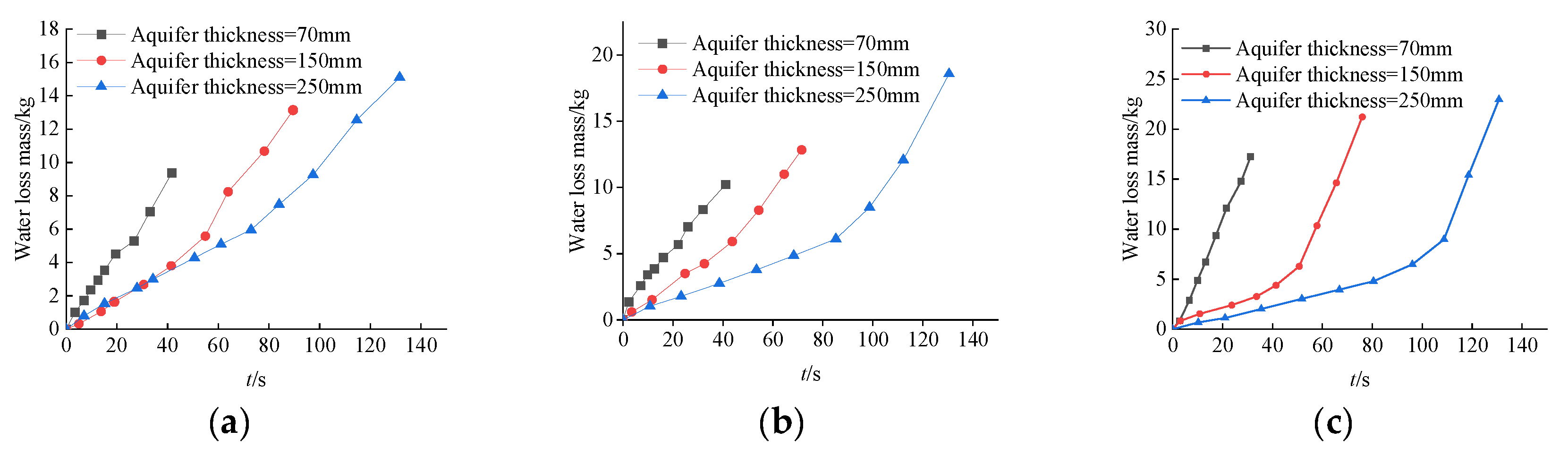 Figure 10a,b, at fracture widths of 6 mm and 8 mm, the water and sand inrush rate is low. In the thick aquifer (250 mm), the seepage path of water in the sand layer is longer, the sand supply is sufficient, and the pore water pressure can continuously drive the sand to inrush at a higher rate. In the thin aquifers (70 mm and 150 mm), the water and sand inrush rate is similar to that in the thick aquifer (250 mm) in the initial stage; however, due to insufficient sand supply, the water and sand inrush mass decreases, ultimately leading to a decline in the water and sand inrush rate.