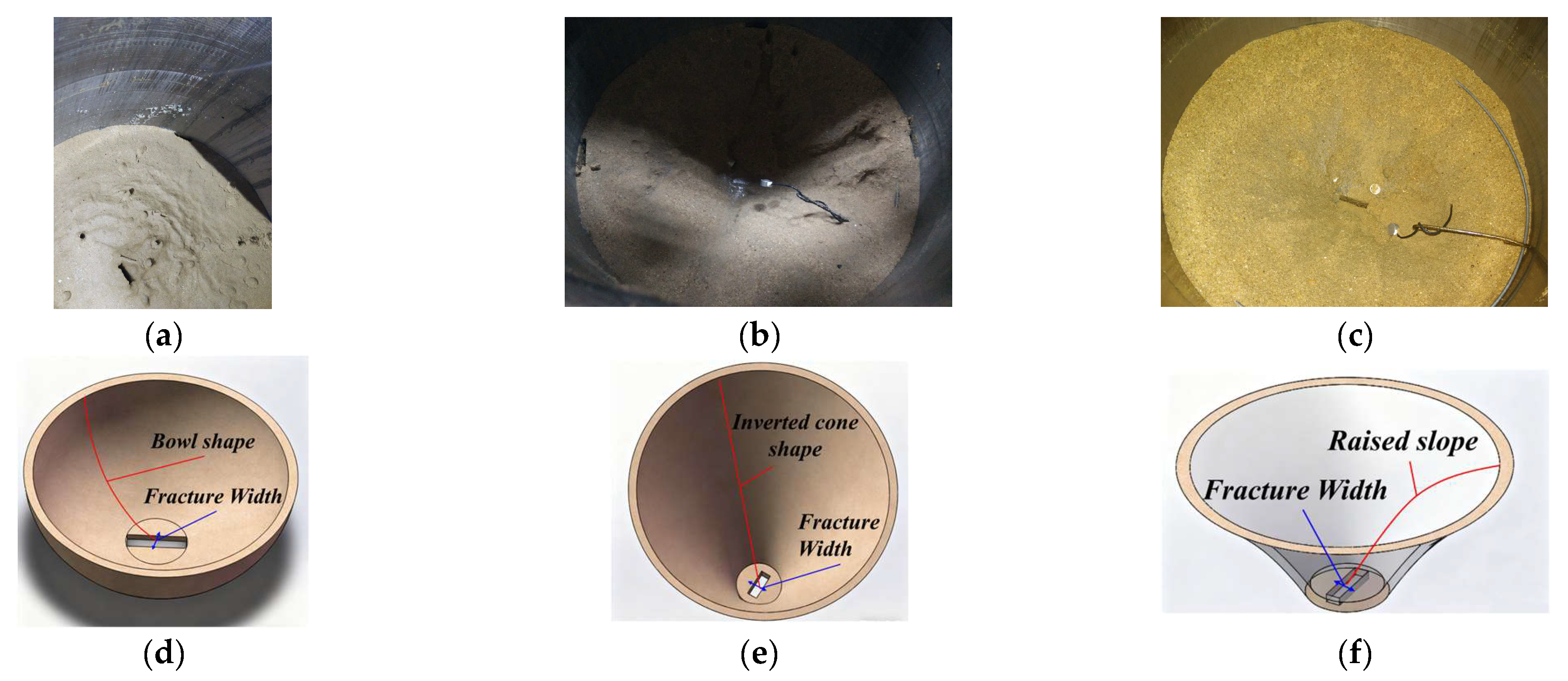 25] pointed out that, before entering the fissure, the sand grains formed a funnel shape with a gradually increasing radius, which eventually stabilized. Zhang et al. [