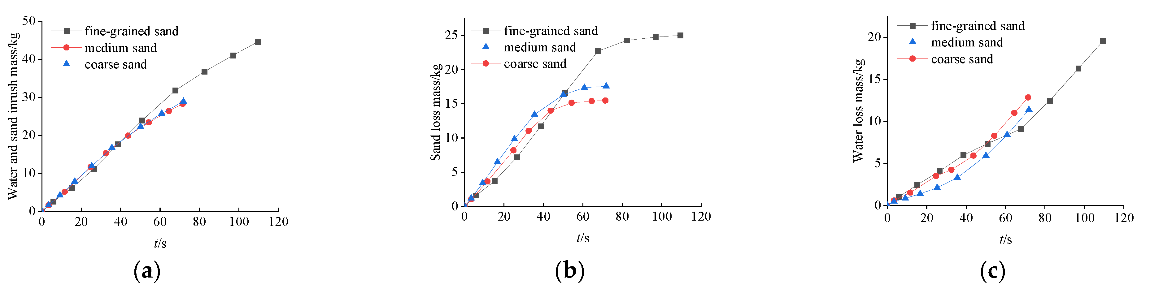 The differences are mainly reflected in: (1) The stable sand loss duration of fine-grained sand (approximately 53 s) is longer than that of medium sand and coarse sand (approximately 28 s), and the sand loss mass of fine-grained sand is significantly greater than that of coarse sand and medium sand, as shown in