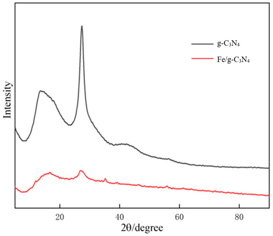 The X-ray diffraction spectrum results of g-C3N4 and 15 wt% Fe/g-C3N4 are shown in Figure 2. It can be seen in the figure that diffraction peaks can be observed near 13.4 °C and 27.4 °C for g-C3N4 and 15 wt% Fe/g-C3N4, corresponding to the (100) and (002) crystal planes of g-C3N4, respectively, but compared with pure g-C3N4, the diffraction peak intensity of 15 wt% Fe/g-C3N4 is greatly weakened, and the diffraction peak shifts slightly to a large angle. The results indicate that Fe doping does not change the crystal structure of g-C3N4 but inhibits the growth of g-C3N4. Fe doping changes the C/N ratio during the thermal polycondensation process, which leads to different degrees of polycondensation reflected and further leads to smaller crystal plane spacing of g-C3N4, thus increasing the specific surface area of the crystal and improving the photocatalytic activity. Iron doping in g-C3N4 can significantly change the lattice spacing, and the lattice spacing is optimal at 15 wt% [20,21]. Figure 2 shows no characteristic peaks of iron-containing substances, which may be due to too little iron doping or iron ions doped into the framework of g-C3N4 by Fe–N bonds in metalloporphyrins or metallophthalocyanines, which is basically consistent with literature reports [22,23].