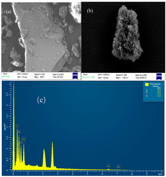 SEM characterization of the catalyst (a) g-C3N4; (b) 15% Fe/g-C3N4; (c) EDS energy spectrum of 15 wt% Fe/g-C3N4.