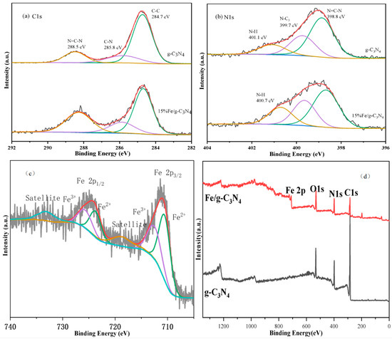 Fe/g-C3N4 was further investigated by XPS characterization. Since no obvious Fe-related characteristic peaks were detected in the previous characterization of the 15 wt% Fe/g-C3N4 catalyst, the surface state of the g-C3N4 and 15 wt% Fe/g-C3N4 catalysts was further analyzed by XPS, and the doping state of Fe was determined. Figure 4 shows the XPS spectra of C1s (a), N1s (b), and Fe2p (c) levels of the g-C3N4 and 15 wt% Fe/g-C3N4 catalysts. From the full spectrum analysis shown in Figure 4d, it can be seen that the surface of 15 wt% Fe/g-C3N4 contains C, N, O, Fe, and other elements, which is consistent with the results of the EDS spectrum, where O comes from oxygen adsorbed in the air of the sample and the lower peak of Fe is due to the relatively small doping amount of iron. Figure 4a shows the XPS spectra of C1s for g-C3N4 and 15 wt% Fe/g-C3N4, divided into three characteristic peaks with binding energies of 284.7 eV, 285.8 eV, and 288.5 eV, corresponding to the C–C bond, C–N bond, and N=C–N bond, respectively. Figure 4b shows the XPS spectra of N1s of g-C3N4 and 15 wt% Fe/g-C3N4, which are divided into three characteristic peaks, with binding energies of 398.8 eV, 399.7 eV, and 401.1 eV, corresponding to the N=C–N bond, N–C3 bond, and N–C bond, respectively. The binding energy of the peak corresponding to the N–C bond of 15 wt% Fe/g-C3N4 is 400.7 eV. This is basically consistent with the conclusions in relevant reports of graphitic carbon nitride materials. Figure 4c is the XPS spectrum of Fe2p. The binding energies corresponding to the two typical peaks are 711.38 eV and 724.93 eV, which proves the existence of Fe, which means that Fe has been successfully doped into the layered structure of g-C3N4. Moreover, relevant literature shows that the binding energy of Fe3+ and N forming the Fe–N bond is 711.8 eV, which is very similar to the binding energy of the Fe2p energy level in the 15 wt% Fe/g-C3N4 catalyst, indicating that Fe exists in the form of the Fe–N bond in the 15 wt% Fe/g-C3N4 catalyst.