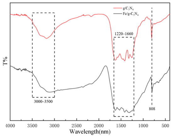 The infrared spectra of g-C3N4 and 15 wt% Fe/g-C3N4 are shown in Figure 5, which shows that the absorption peaks are concentrated in three regions, 808, 1220–1660, and 3000–3500 cm−1, which is consistent with the literature reports. The absorption peak position of 15 wt% Fe/g-C3N4 is basically consistent with g-C3N4, indicating that the doping of iron does not change the skeleton structure of g-C3N4. The absorption peak near 808 cm−1 corresponds to the bending vibration peak of triazine cyclic compounds, the absorption peak at 1220–1660 cm−1 corresponds to the stretching vibration peak of the aromatic C–N bond, and the absorption peak at 3000–3500 cm−1 corresponds to the stretching vibration peak of the N–H bond, which indicates that the condensation of products obtained by heating urea directly is incomplete, and there is a N–H bond at the edge of the layered structure. This may be due to the fact that Fe doping weakens the stretching vibration of the C–N bond, and water adsorbed on the surface of the material also affects it. No iron-related absorption peaks (e.g., iron, iron oxide, iron nitride, iron carbide, etc.) are detected, which may be due to the relatively small amounts of iron doping or iron ions doped into the framework of g-C3N4 in the form of Fe–N bonds in metalloporphyrins or metallophthalocyanines.
