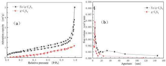 Adsorption/desorption curves of g-C3N4 and 15%Fe/g-C3N4 (a); N2 and pore size distribution curves of g-C3N4 and 15%Fe/g-C3N4 (b).