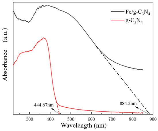 The UV–visible diffuse reflectance spectra of g-C3N4 and 15 wt% Fe/g-C3N4 are shown in Figure 7. It can be seen that, compared with g-C3N4, the absorption wavelength of 15 wt% Fe/g-C3N4 shifts to the long wave direction, i.e., a red shift occurs, which enhances its response to visible light. The 15 wt% Fe/g-C3N4 photocatalyst has strong absorption of light in a wide range of 220 nm–780 nm, i.e., absorption in the ultraviolet and visible light regions. In addition, the absorption thresholds of g-C3N4 and 15 wt% Fe/g-C3N4 are 444.7 nm and 884.2 nm, respectively, and the band gaps of g-C3N4 and 15 wt% Fe/g-C3N4 are calculated to be 2.79 eV and 1.4 eV, respectively, indicating that Fe doping can effectively reduce the band gap energy of g-C3N4 and narrow the band gap. According to the energy level theory, the doping of iron forms impurity energy levels in the g-C3N4 forbidden band. By absorbing photons with low energy, electrons can realize energy level transition and then absorb photons with a longer wavelength, greatly expanding their visible light response range and improving the utilization rate of visible light.