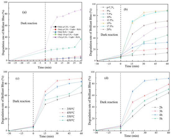 The effect of Fe/g-C3N4 synthesis conditions on the degradation efficiency of the brilliant blue pollutant was investigated and compared through experiments. As shown in Figure 8a, the degradation efficiency of brilliant blue was 87.1% under the condition of “light +15 wt% Fe/g-C3N4 + H2O2”, which means that the degradation efficiency of brilliant blue was greatly improved compared with other treatment processes, which was due to the doping of Fe to promote the production of •OH and accelerate the oxidation degradation of brilliant blue. This indicates that Fe/g-C3N4 has an obvious catalytic effect on the degradation of brilliant blue in the photo-assisted Fenton reaction system. As shown in Figure 8b, keeping other conditions unchanged, changing the mass ratio of Fe doping (5%, 7.5%, 10%, 12.5%, 15%, 17.5%, and 20%, respectively), a series of xwt%Fe/g-C3N4 photocatalysts were prepared. The results show that the degradation efficiency of the 15 wt% Fe/g-C3N4 composite photocatalyst is the highest, and the degradation efficiency is 87.1% under visible light for 60 min, which may be due to the optimal Fe content ratio, specific surface area, and pore volume of 15 wt% Fe/g-C3N4, which is similar to other literature [24,25].