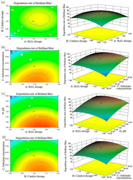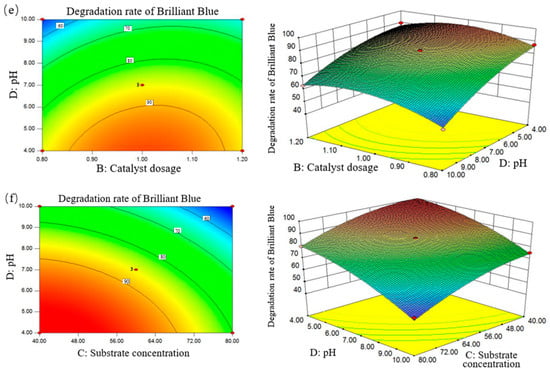 The shape of the response surface curve and contour plot was examined to analyze the effects of H2O2 dosage, catalyst dosage, substrate concentration, and pH value on the degradation efficiency of brilliant blue. The steeper the slope of the response surface curve, the more obvious was the interaction between them. The effects of H2O2 dosage (A), catalyst dosage (B), substrate concentration (C), and pH value (D) on the degradation efficiency of brilliant blue are shown in Figure 9a–f.