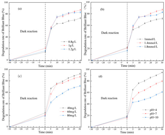 As shown in Figure 10c, under the same control variables, the degradation efficiency of brilliant blue gradually decreases with the increase in brilliant blue concentration. When the concentration is 40 mg/L, the degradation efficiency is 92.3%; when the concentration is 80 mg/L, the degradation efficiency decreases to 71.2%. This may be because, with the increase in brilliant blue concentration, the amount of brilliant blue per unit volume increases, and the amount of brilliant blue involved in the photocatalytic reaction increases. However, under a certain amount of catalyst, the amount of brilliant blue effectively degraded by the photocatalytic reaction is less than that added to the solution, so the greater the concentration of brilliant blue added, the lower the degradation efficiency is [36]. The effect of pH value on the degradation of brilliant blue can be seen in Figure 10d. With the increase in pH value, the degradation efficiency of brilliant blue gradually decreases. When the pH value is 4, the degradation efficiency reaches 94.8%; when the pH value is 10, the degradation efficiency decreases to 60.9%. This may be because Fe3+ is not easy to hydrolyze into precipitation under acidic conditions but exists in the form of ions, which improves the utilization of •OH, and H+ can promote the decomposition of H2O2, which is conducive to the formation of •OH and promotes the degradation efficiency of brilliant blue in solution. In addition, as an acid dye, brilliant blue has a negative charge, which is beneficial to the absorption of brilliant blue by the catalyst and promotes the oxidation degradation of brilliant blue under acidic conditions, while it is unfavorable to the adsorption and reaction of brilliant blue by the catalyst under neutral or alkaline conditions. Therefore, when the pH ≥ 7, the degradation conducive of brilliant blue decreases gradually with the increase in pH. Göktaş [37] studied the synergistic effect of pH value (4–11) and different light sources (ultraviolet lamp, LED lamp, sunlight, halogen lamp) on the photocatalytic degradation of methylene blue, and for the first time, the photocatalytic degradation of methylene blue under different photocatalytic activity light irradiation was studied comprehensively, which confirmed the influence of pH value on the photodegradation of pollutants.