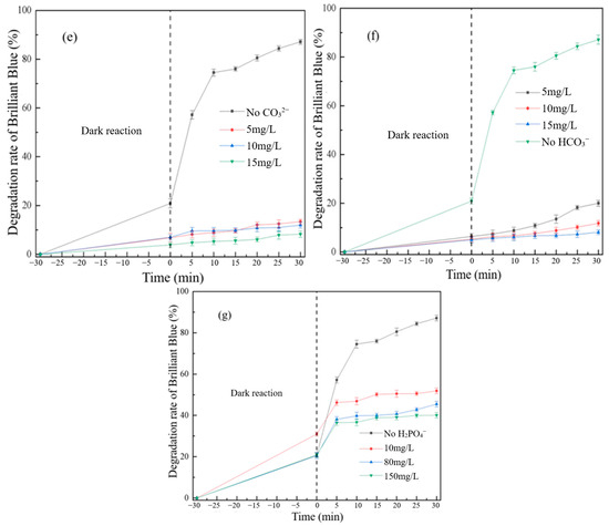 The influence of different inorganic ions on the degradation efficiency of brilliant blue: (a) Cu2+; (b) Mg2+; (c) Mn2+; (d) Cl−; (e) CO32−; (f) HCO3−; (g) H2PO4−.