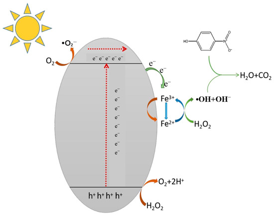When 15% Fe/g-C3N4 and H2O2 were added into the reaction system, H2O2 combined with Fe2+ in Fe/g-C3N4 to generate a large amount of •OH and Fe3+, and •OH oxidized and degraded the target pollutants on the catalyst surface, thus generating CO2 and H2O. Moreover, the combination of the Fe–N bond accelerated the cycle of Fe3+/Fe2+, promoted the regeneration of Fe2+, and generated more •OH, which accelerated the degradation of the target pollutants. H2O2 decomposes into O2 and H2O, where O2 receives e-, which generates •O2− after the reaction, •O2− can reduce Fe3+ to Fe2+, Fe2+ reacts with H2O2 to generate •OH, and •O2− itself also plays a role in degradation [39]. The reaction mechanism diagram is shown in Figure 12.