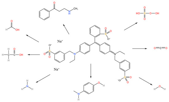 Brilliant blue is metallic luster particles or a powder, odorless, light, heat resistant, and soluble in water and ethanol. It is cyan when in weak acid, yellow when in strong acid, and purple when boiled and in alkali. The photodegradation pathway of the dye brilliant blue mainly refers to its light A process of chemical structure decomposition under the action of light (especially ultraviolet or visible light) [42]; Figure 13 shows the photolysis of brilliant blue, direct photolysis (the breaking of chemical bonds in the excited state of the brilliant blue molecule itself, such as azo bond, benzene ring structure, etc.); and indirect photolysis (excited state brilliant blue reacts with oxygen (O2) in the environment to generate superoxide radicals (•O2−), hydroxyl radicals (•OH), and other strong oxidizing species, which attack the molecular structure). This process has important implications for environmental remediation (e.g., dye wastewater treatment) and photocatalytic research [43].