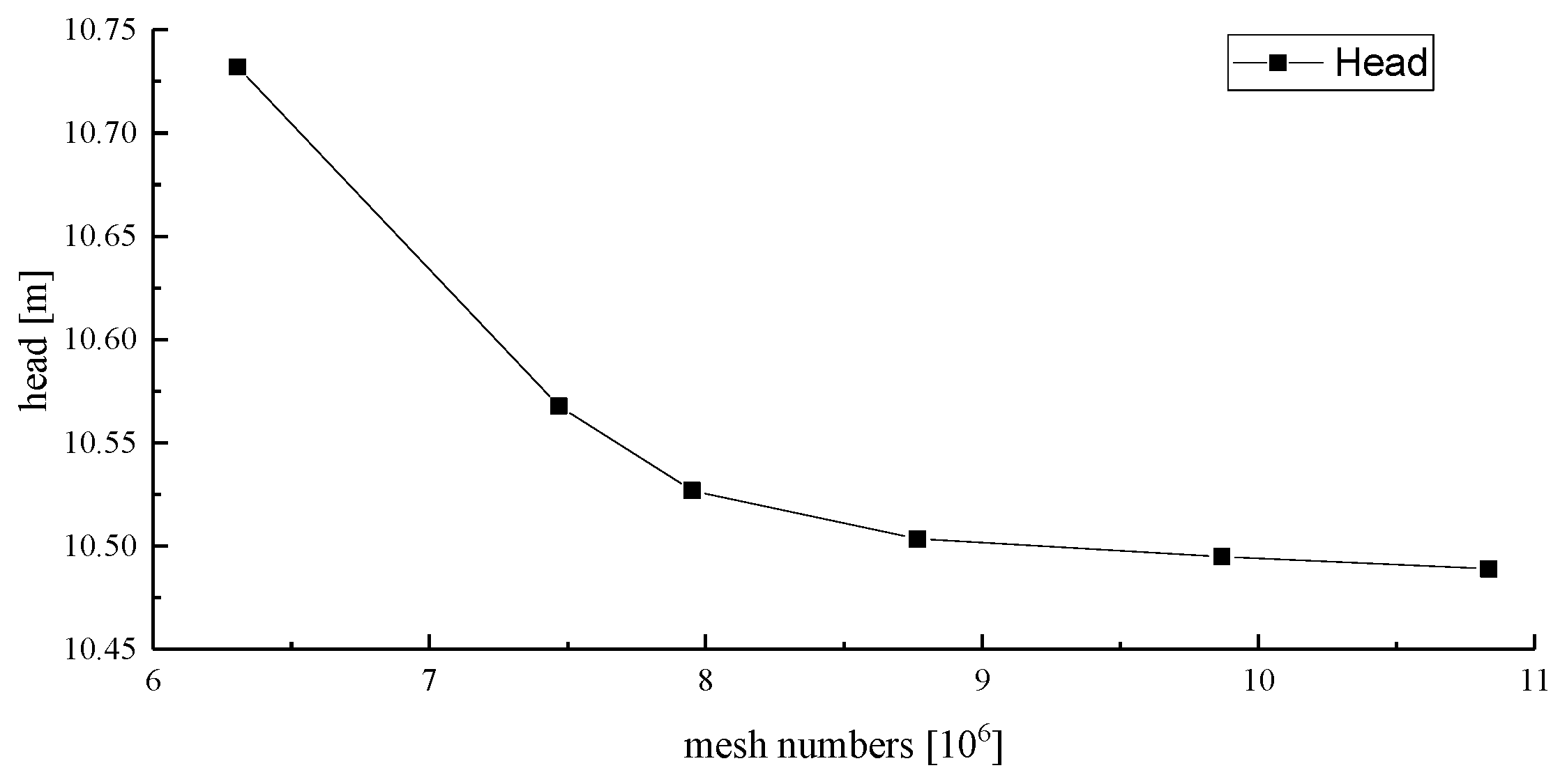 Because grid density and quality exert a decisive influence on both accuracy and computational overhead [26], a rigorous grid-independence study was performed following the procedure illustrated in Figure 2. When the element count exceeded 9.86 × 106, the predicted head varied by <0.1% relative to the next finer level; this mesh balanced against available computational resources, and was therefore adopted as the criterion for finalizing the component-wise mesh densities summarized in Table 2.