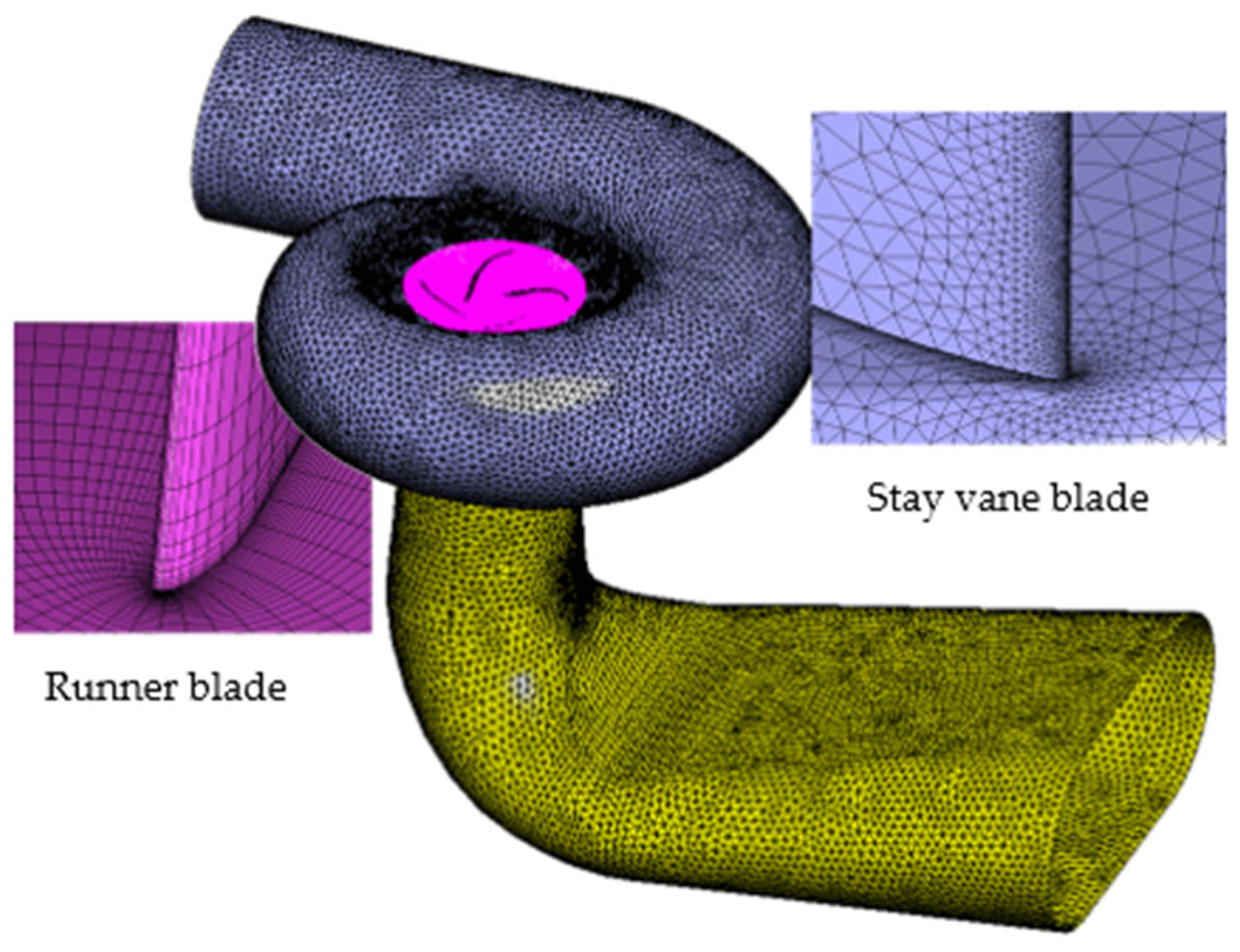 Accordingly, systematic mesh examination and successive refinement were carried out until the near-wall average y+ values fulfilled the computational accuracy requirement for the turbulence model employed. The resultant wall y+ values for the runner, spiral case, and suction-conduit components are reported in Table 2; a schematic illustration of the computational grid adopted in the present CFD simulations is provided in Figure 3.