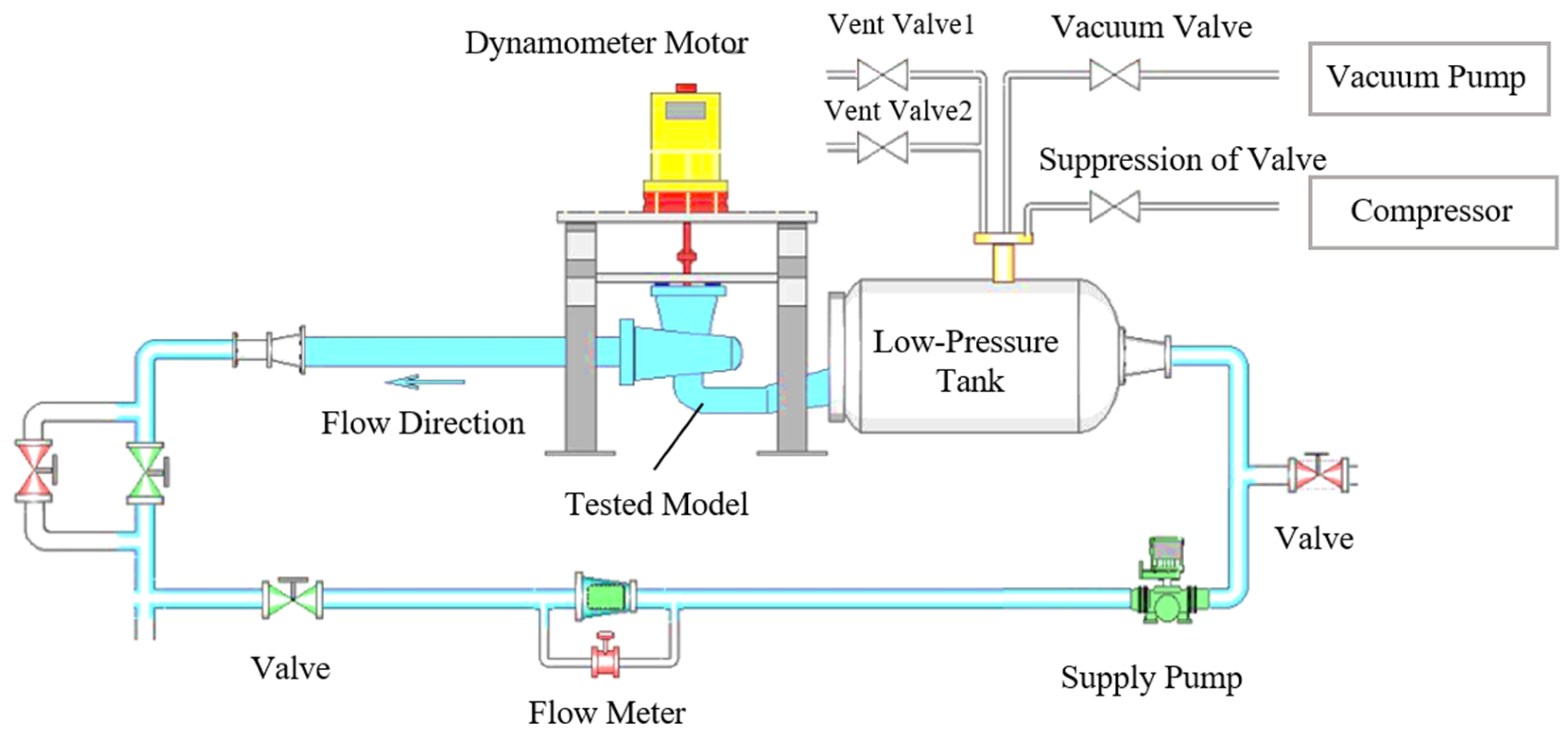 A schematic map of a hydraulic machinery test stand is shown in Figure 4. Total test uncertainty of the experiment on the test-stand VI was ±0.3%. The pump model test method meets the requirements of IEC60193 [29].