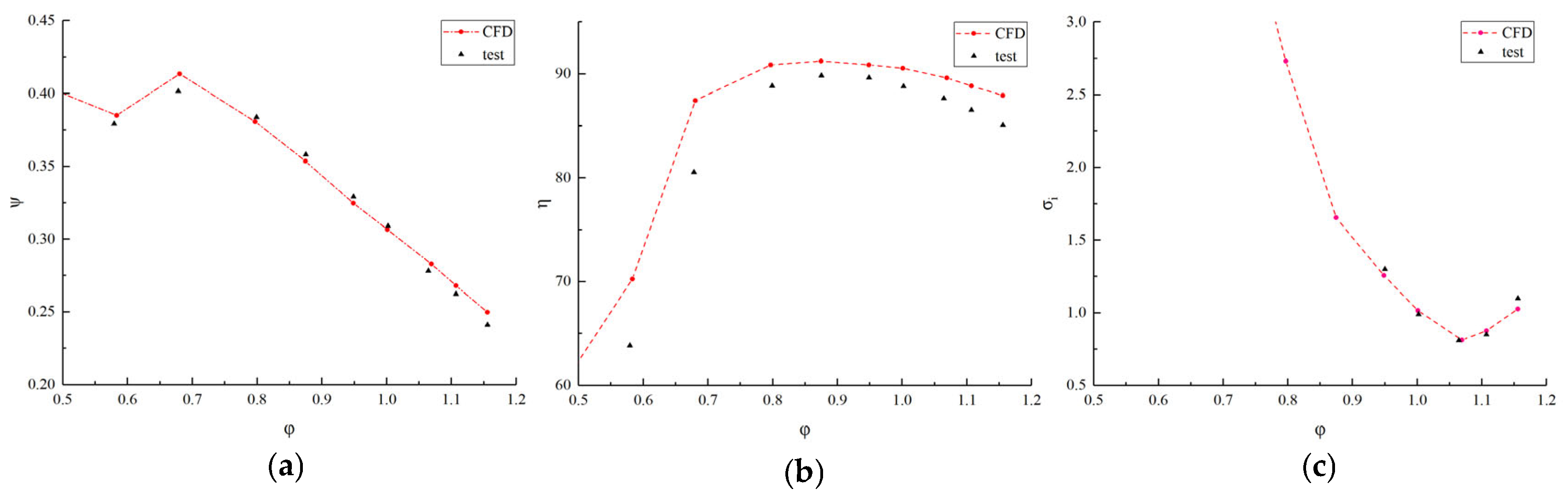 Mixed-flow pumps typically operate within a specific speed range of 300–600, categorizing the pump studied in this paper as a medium-to-high specific speed mixed-flow pump. To facilitate a direct comparison with other mixed-flow pumps of similar specific speeds, the pump performance is routinely interpreted in terms of dimensionless parameters. Therefore, define the head coefficient ψ, the flow rate coefficient φ, and the initial cavitation coefficient σi as follows