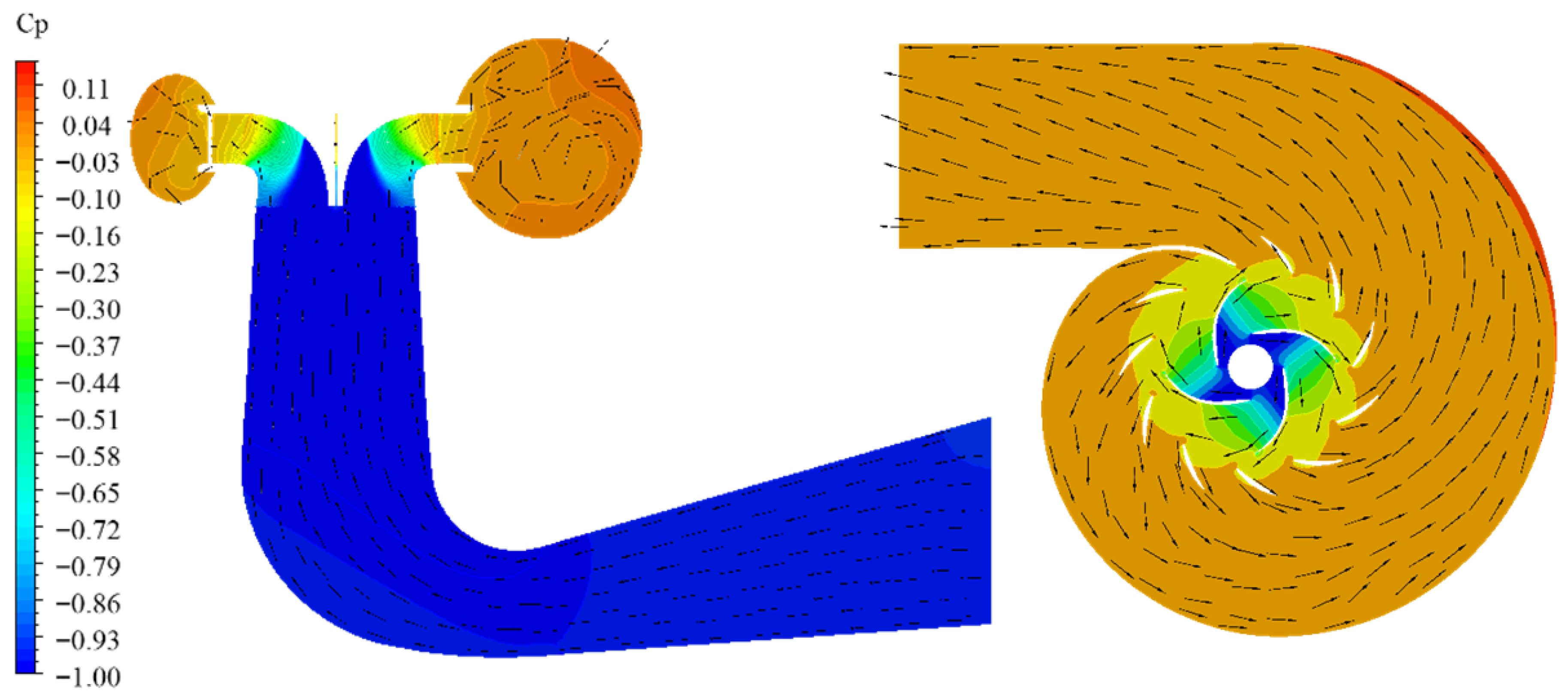 Flow regime of the mixed flow pump was taken into consideration. The static-pressure distribution and relative-velocity vector fields on the meridional (mid-stream) symmetry plane as well as the mid-span layer of the mixed-flow pump are presented in Figure 7, where the dimensionless pressure coefficient Cp is defined as follows.