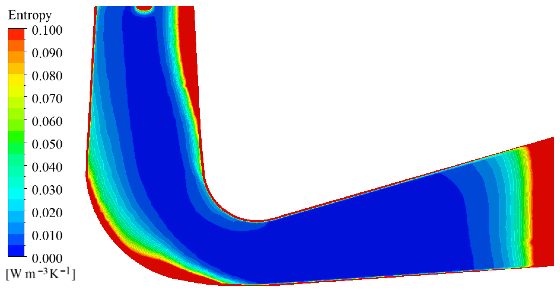 As continuous geometric optimization has reduced elbow conduit losses and improved pump efficiency, the flow regime inside modern elbow conduits is generally smooth and conventional flow regime analysis has become less effective for further improvements [21]. Continued advancements are impeded by the difficulty of visualizing, locating, and quantifying remaining flow energy dissipation (FED) mechanisms [22]. The Second Law of Thermodynamics (SLT) has therefore attracted increasing attention for its ability to identify irreversible energy transitions, and has been applied to quantify and localize losses in various hydraulic machines.