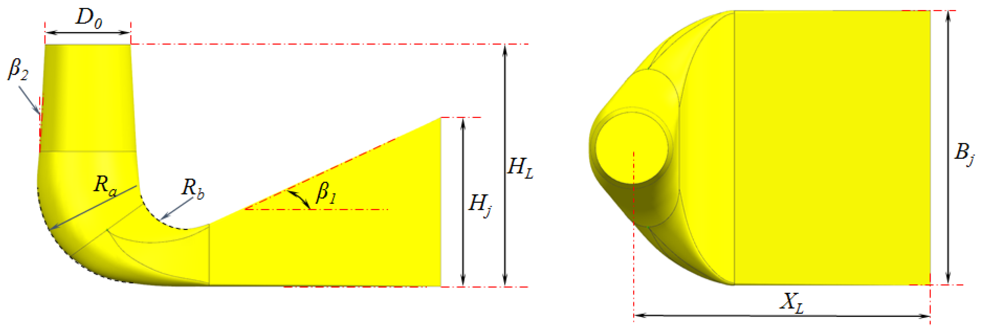 Shi et al. employed parametric modeling methods to optimize transition curves of an elbow conduit, without altering control dimensions, resulting in reducing conduit losses while improving outlet velocity uniformity [15]. Huang et al. conducted comparative analyses of conduits with two different heights and bend radii under a range of operating conditions, demonstrating that bend profile exerts a significant influence on the turning flow [16]. Suppressing separation within the bend was found to extend the high-efficiency operating range of the pump. Pei Ji combined numerical simulation with neural network analysis to explore the sensitivity of conduit geometry to the pump efficiency, rapidly identifying optimal geometric configurations from large design spaces [17]. Significant reductions in conduit losses and overall efficiency improvements were achieved.