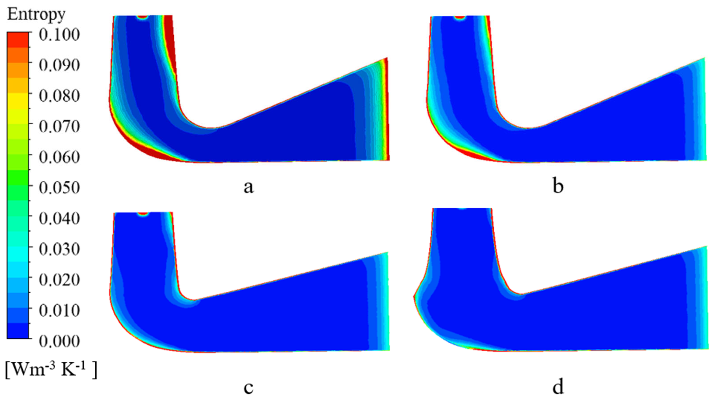 Wang et al. employed entropy-generation theory to map the loss-distribution characteristics of a mixed-flow turbine at its best efficiency point [23]. Chen et al. investigated the entropy production within a two-stage storage pump over a broad operating range; this revealed that under partial-load conditions, flow separation driven by high tangential velocity contributes most to energy dissipation, whereas at overload conditions, wall friction and fluid–wall impacts were the primary dissipative mechanisms [24]. To the best of the authors’ knowledge, however, the application of entropy-generation analysis to optimize elbow suction conduits in mixed-flow pumps has rarely been reported.