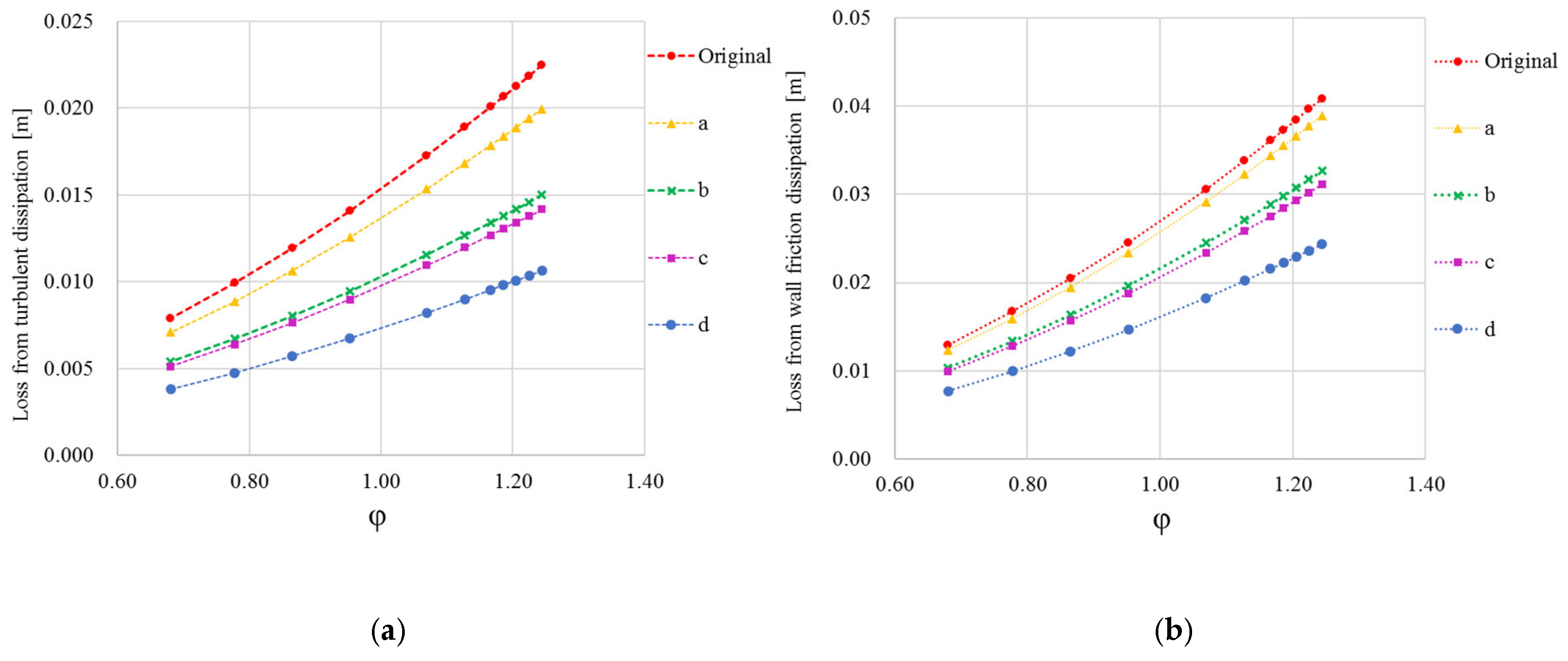 Figure 12. Head loss over the entire operating range. (a) Hydraulic loss induced by turbulent dissipation; (b) Hydraulic loss induced by wall-effect.