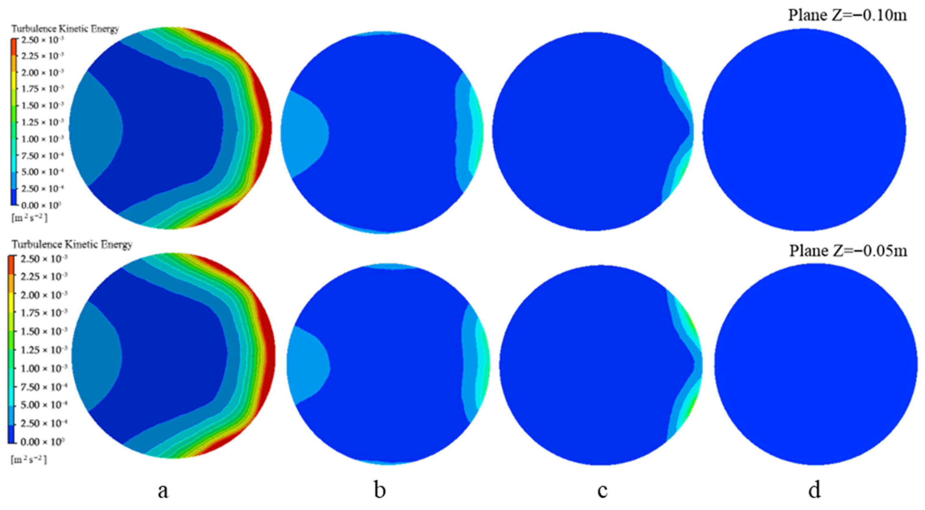 In the simulation, the turbulence model was set as the RNG k-ε model. Although more advanced models such as SAS-SST or LES offer higher fidelity for transient separations, the RNG k-ε model has been widely validated for steady-state simulation of swirling and recirculating flows in curved conduits [27,28], while offering a balance between accuracy and computational cost for engineering analysis. “High resolution” was chosen as the solution control parameter. Maximum iteration number was 500. A convergence criterion of 1 × 10−5 was set to achieve a balance between the calculation accuracy and time.