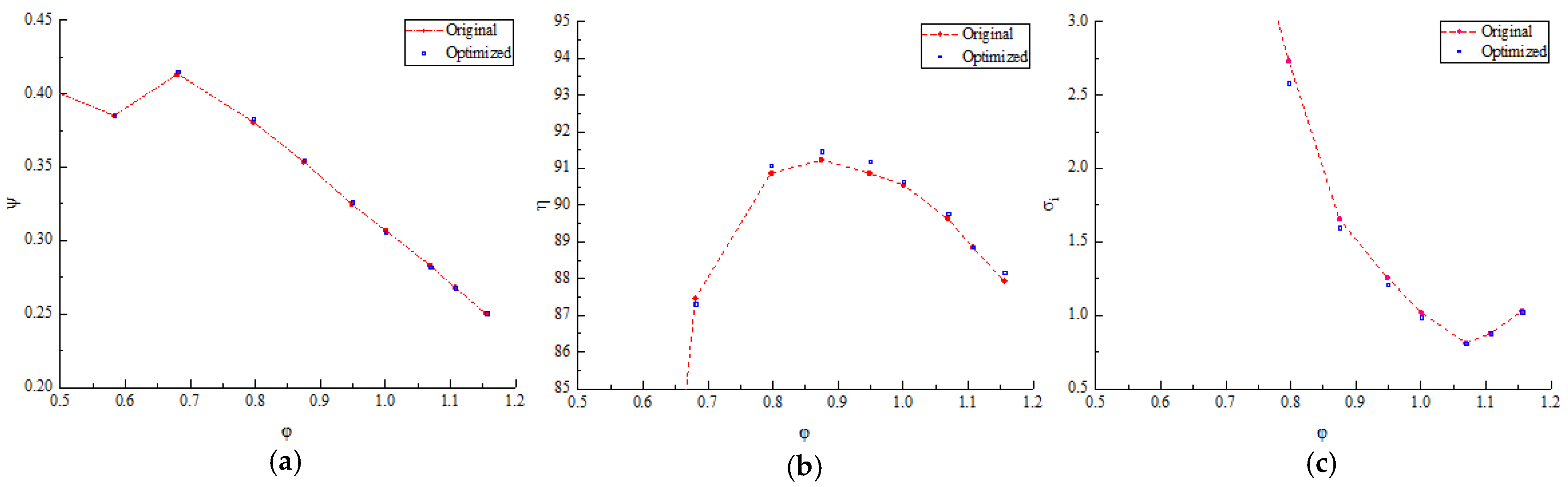 Figure 6b presents the corresponding comparison for the efficiency–discharge characteristics. Across the entire operating envelope, the predicted trends of both head coefficient and efficiency. The deviation remains small near the rated condition, whereas it grows as the operating condition moves away from the rated value. That demonstrates consistent trends with the head–discharge characteristics.