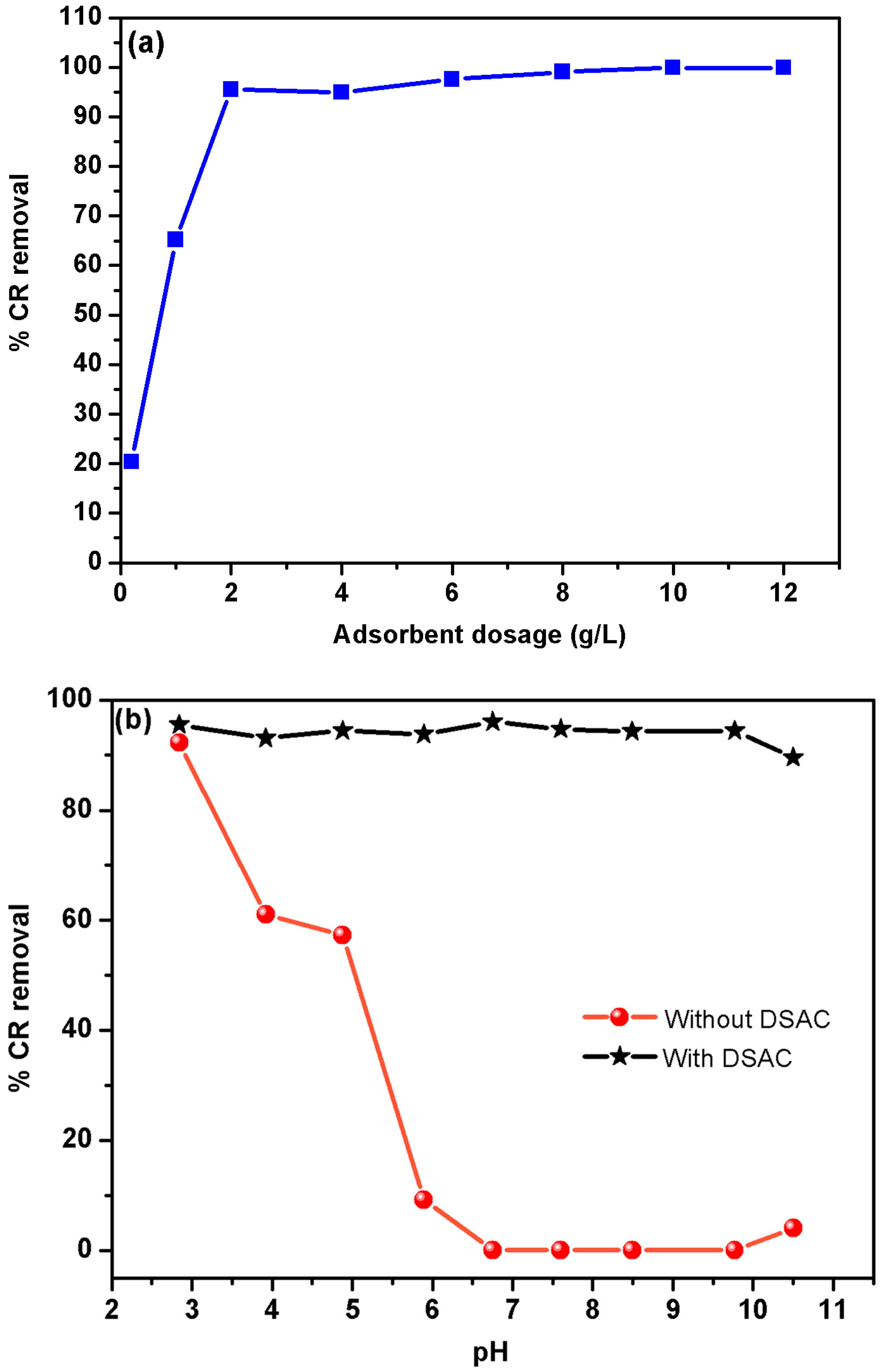 Figure 3a. The result of this study demonstrates that the increase in the DSAC dosage led to a significant improvement in CR removal efficiency, from 20.3% at 0.2 g L