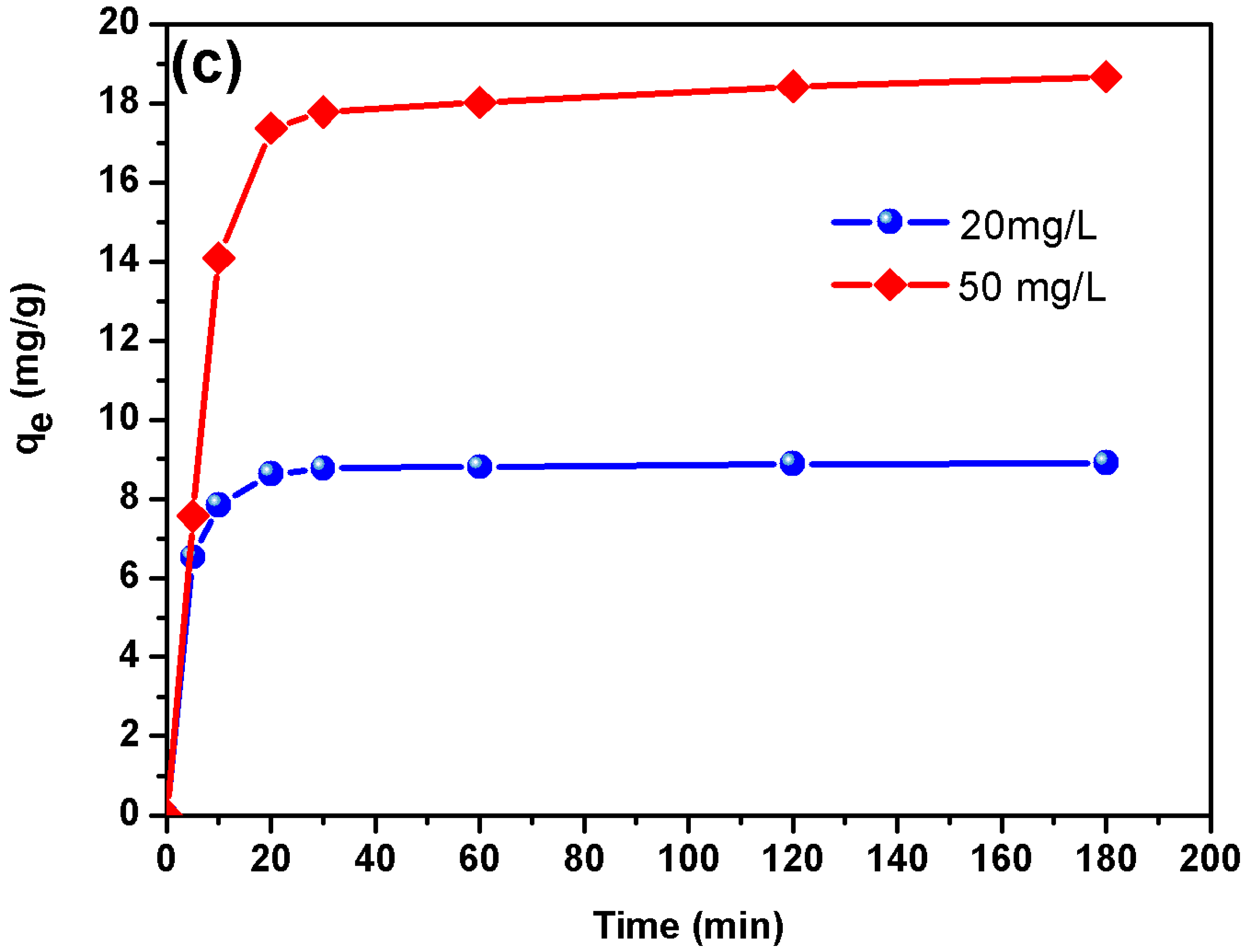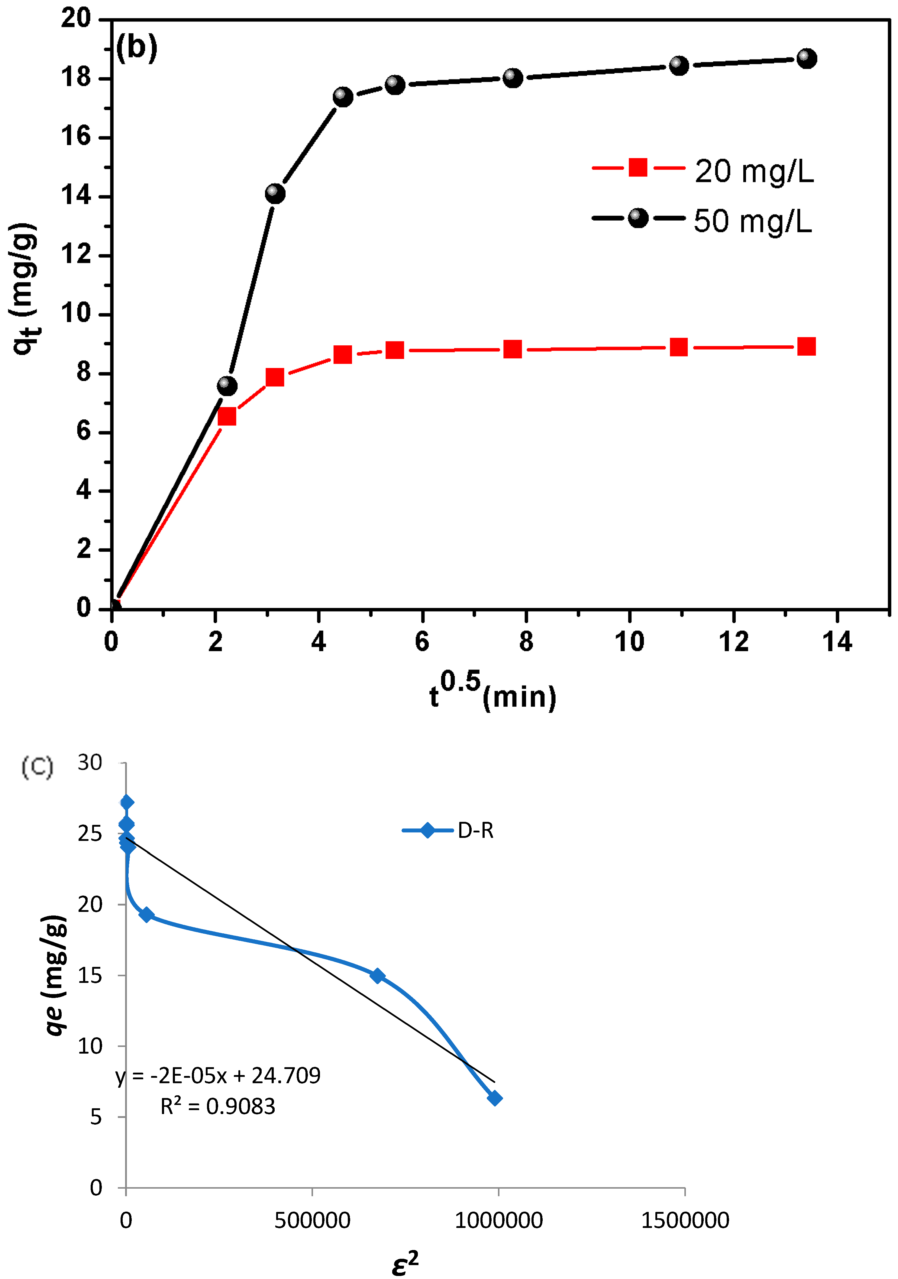 Figure 3c). Adsorption equilibrium for CR was attained within 180 min, beyond which adsorption rates decreased significantly. The process exhibited two distinct kinetic phases. (i) An initial rapid phase, characterized by a sharp increase in adsorption capacity. This is attributed to the immediate occupancy of readily available sites on the adsorbent’s external surface. (ii) A subsequent slower phase, contributing minimally to the overall dye uptake. This stage reflects diffusion-controlled adsorption into the material’s internal pore structure [