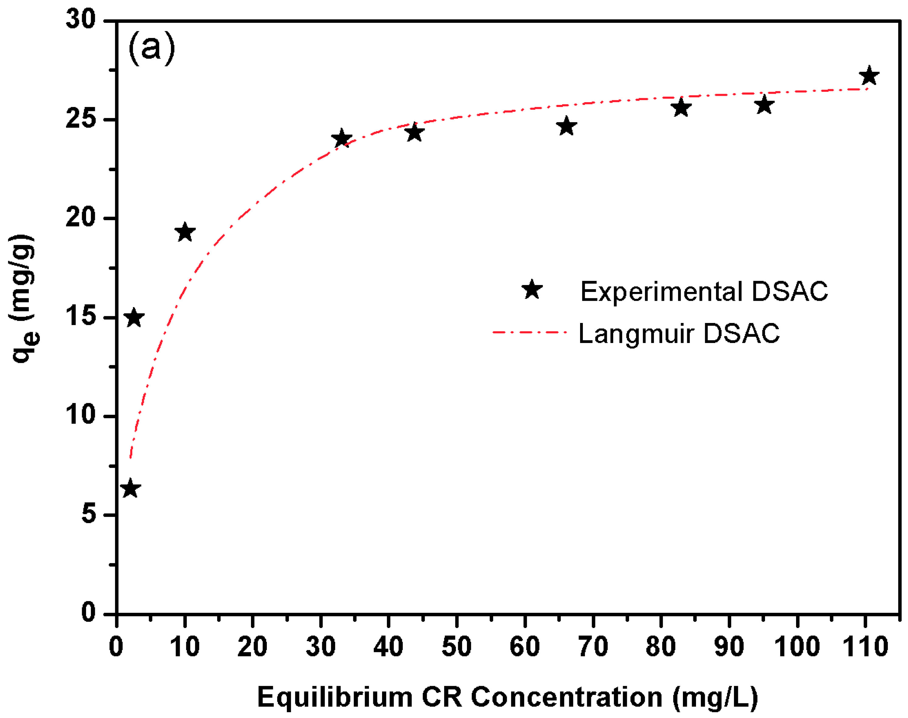 Figure 4a displays the DSAC isotherm profiles for CR. The experimental data demonstrate a strong correlation with the Langmuir isotherm model, suggesting monolayer adsorption onto a homogeneous surface. Notably, this behavior contrasts with literature reports emphasizing mesopore-dominated adsorption mechanisms [