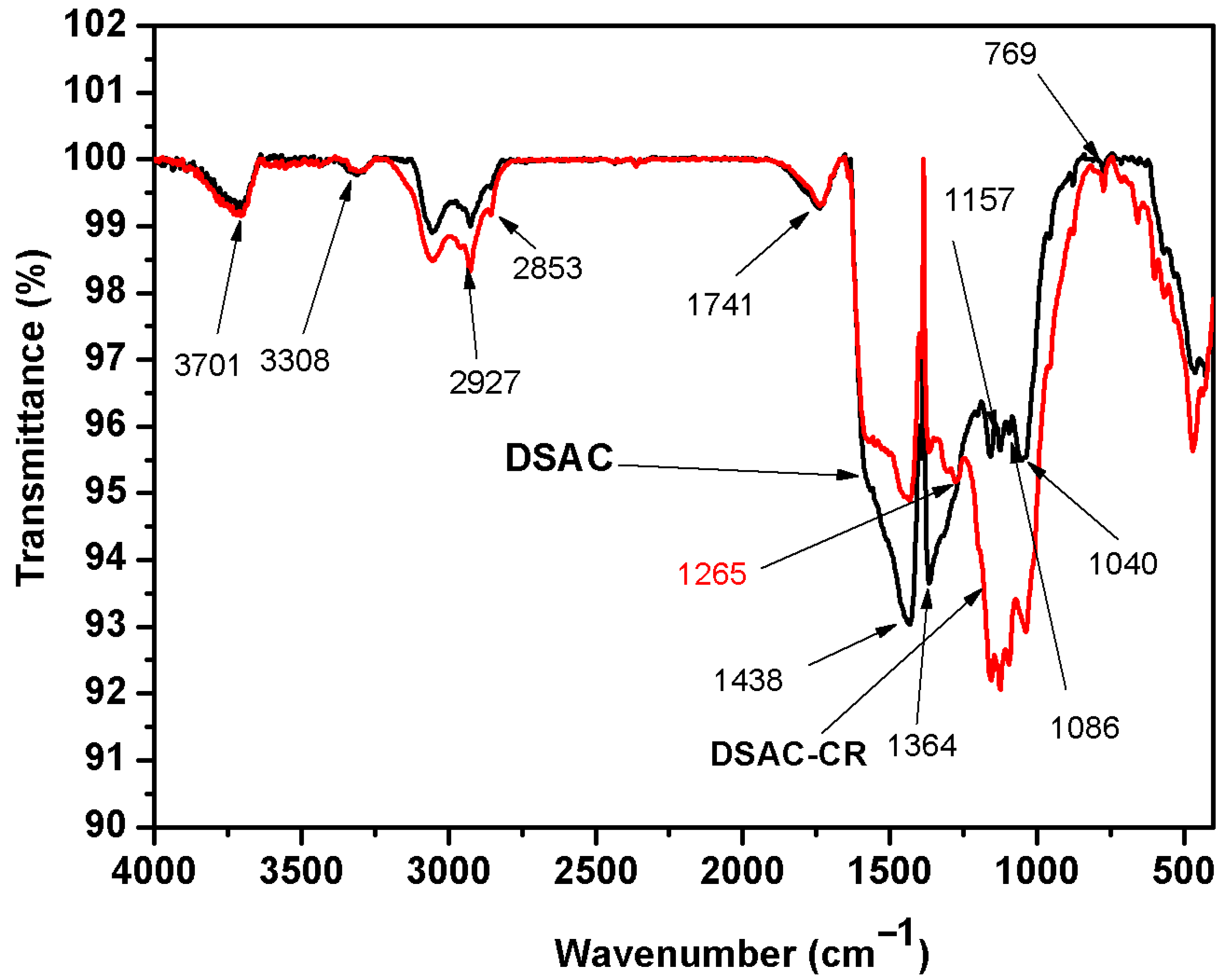 Table 3 displays the elemental analysis findings of DS and DSAC. It can be seen from this table that the percentages of carbon and nitrogen have been increased, while those of hydrogen and oxygen have been decreased.
