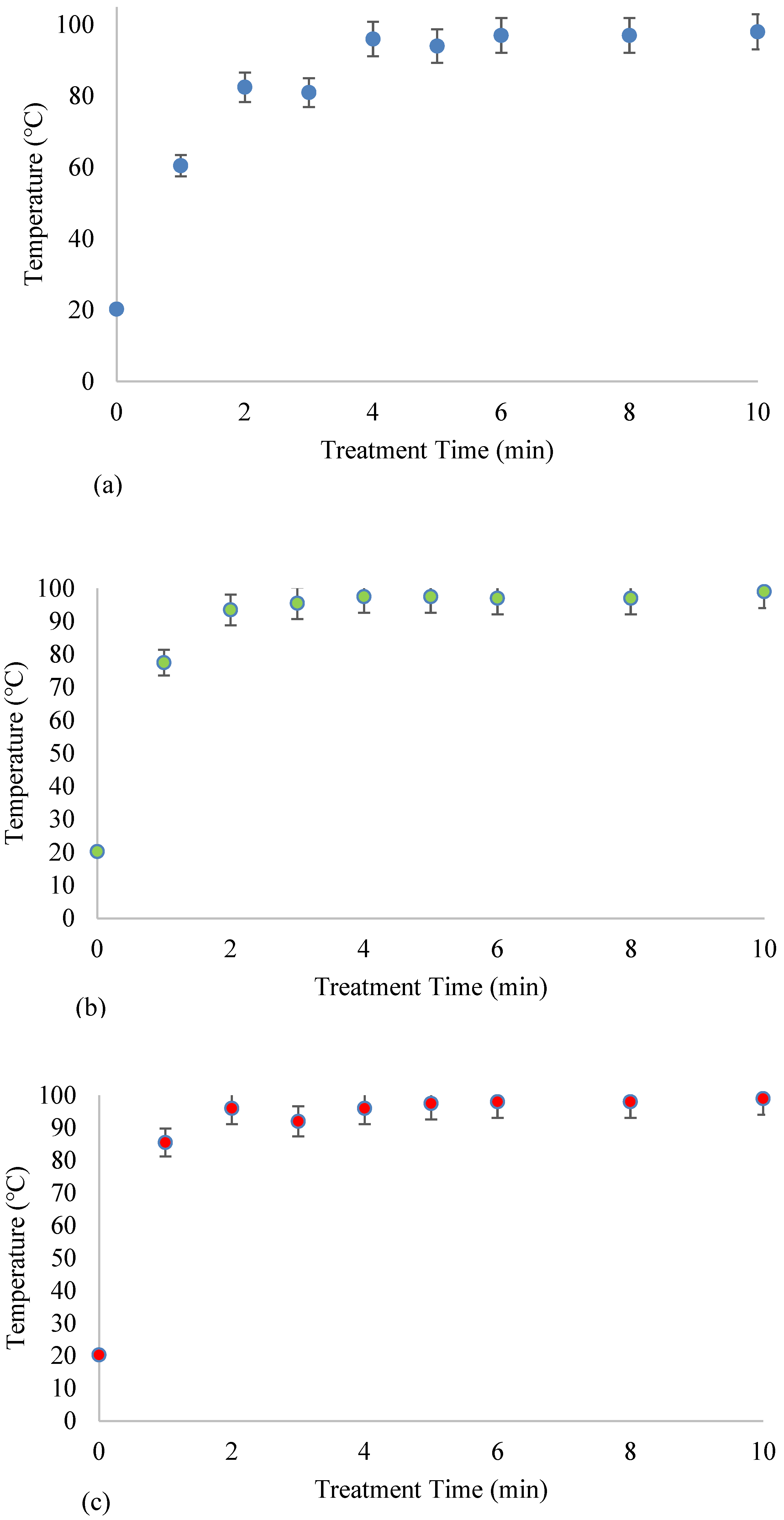 Figure 2 shows the temperature profiles of FS treated at 630 W, 720 W, and 810 W for 1, 2, 3, 4, 5, 6, 8, and 10 min. In general, MW treatment caused a rise in FS temperature from ~20 °C (raw FS) to between 61 ± 0.71 °C and 99 ± 0.00 °C. Two temperature regions were distinguished in