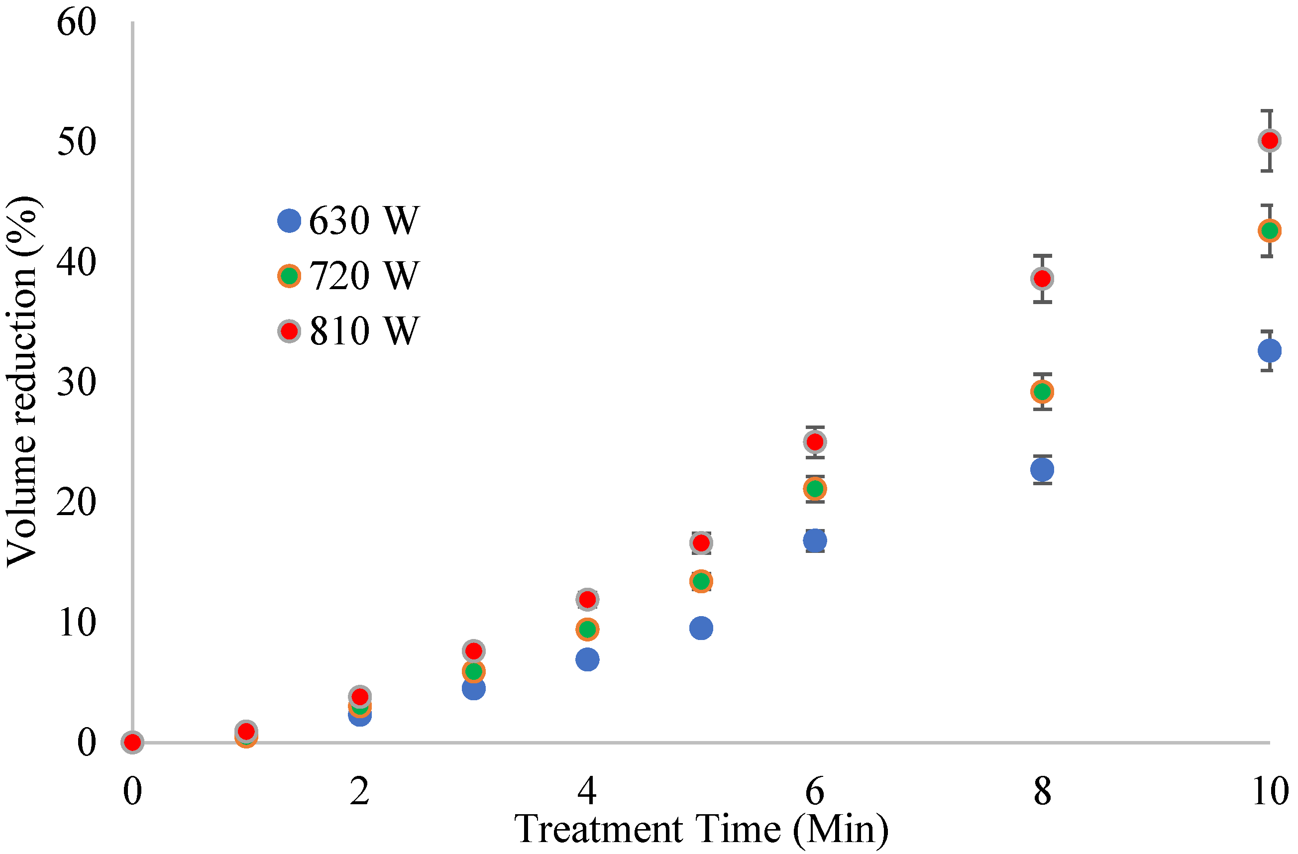 Sludge volume reduction is an important treatment objective as it relates to the volume of solids that can be transported, treated, or disposed of. As stated earlier, MW treatment did not induce volatilization temperatures. Hence, the volume change resulted mainly from removing free water from the FS. Further, the VS content increased in the treated samples due to water loss. Volume reduction varied with the input of MW power and contact time (