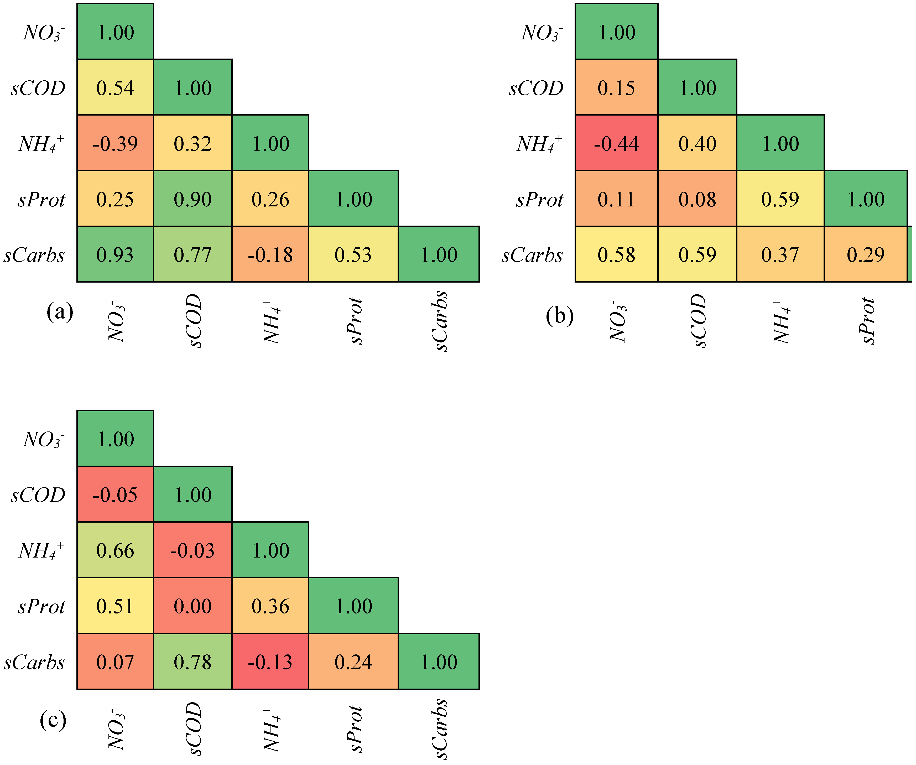 Pearson’s r correlation, presented as a heat map between sCOD and its predictors (sProt, sCarbs, ammonium, and nitrate), is shown in