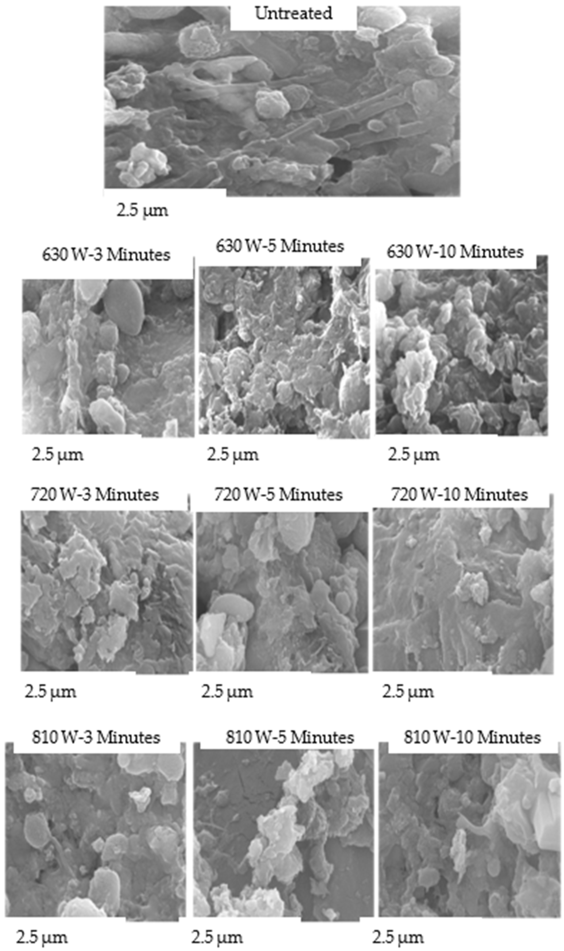 Similarly, increasing MW power increased structural modification. Low MW power (630 W) treatment caused slight deformation, while intermediate- (720 W) and high-power (810 W) treatments produced extensive rupturing, porosity, and localized carbonization due to strong dielectric heating.