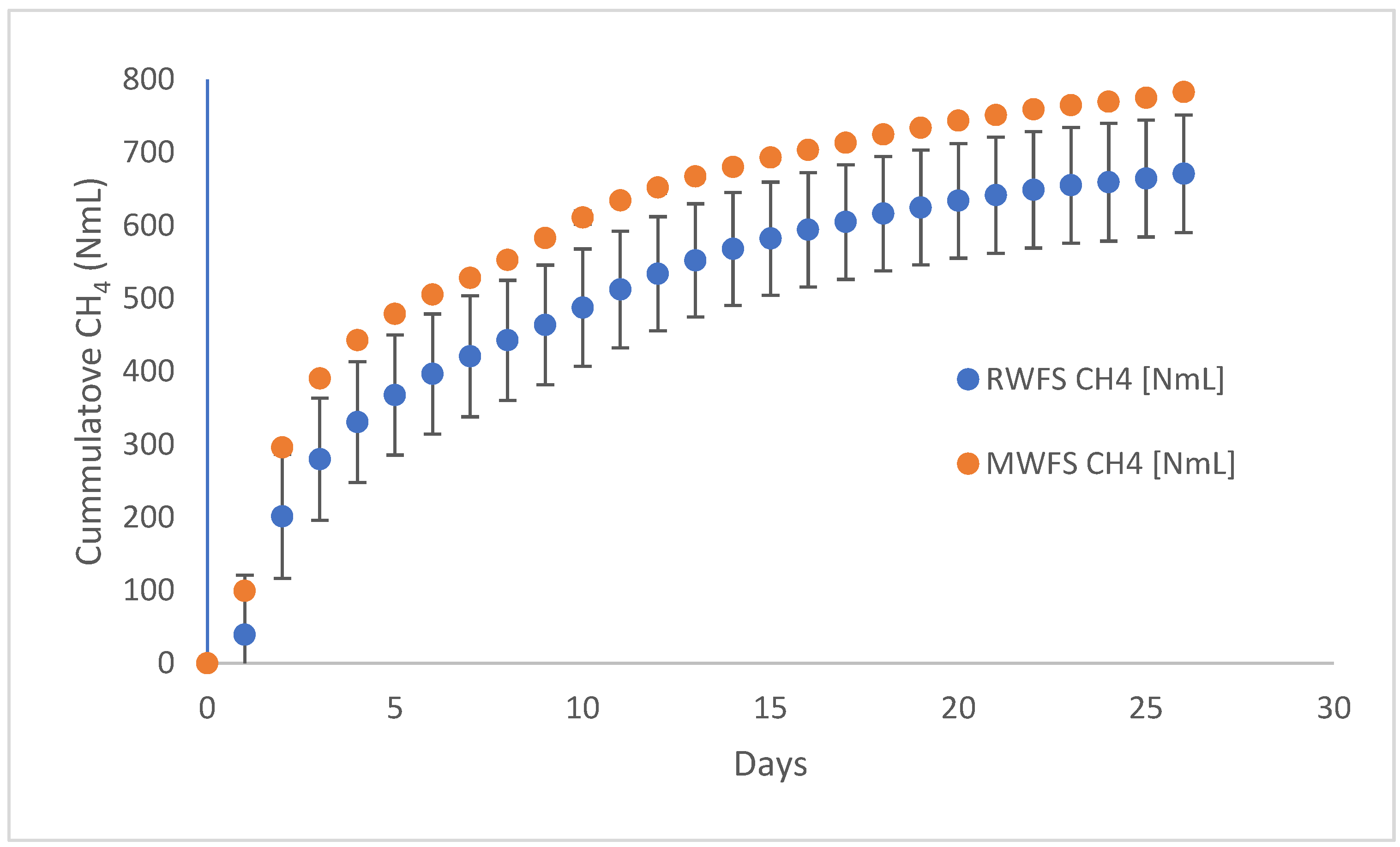 The cumulative and specific methane production of the raw and MW-treated FS and their co-substrates were determined from batch tests. The batch tests were run for 26 days due to logistical issues. The cumulative methane production was higher in MW-pretreated FS than in the raw FS (