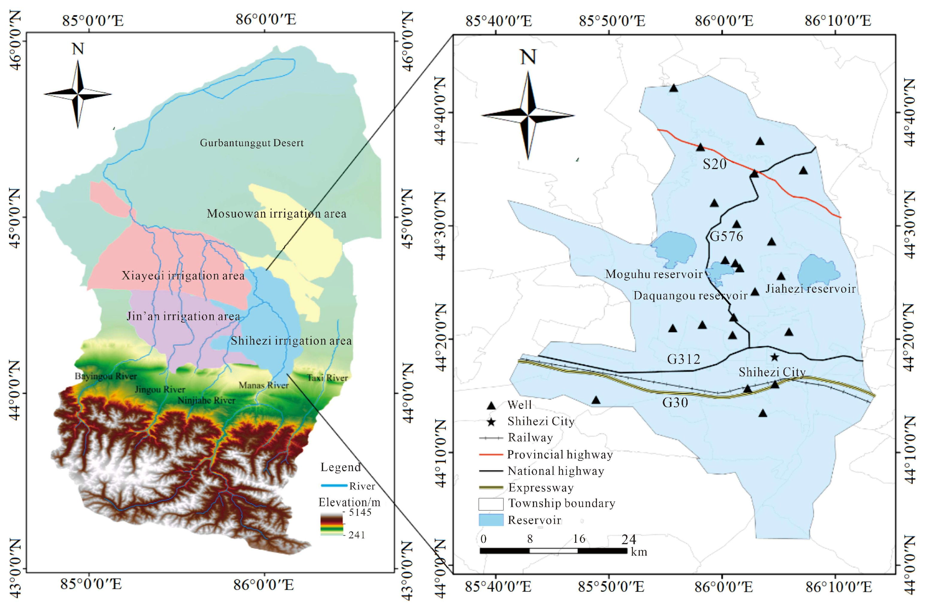 - Huang, X. Study on the Appropriate Control of Groundwater Level in Shihezi City. Master’s Thesis, Xinjiang Agricultural University, Urumqi, China, 2021. [Google Scholar]