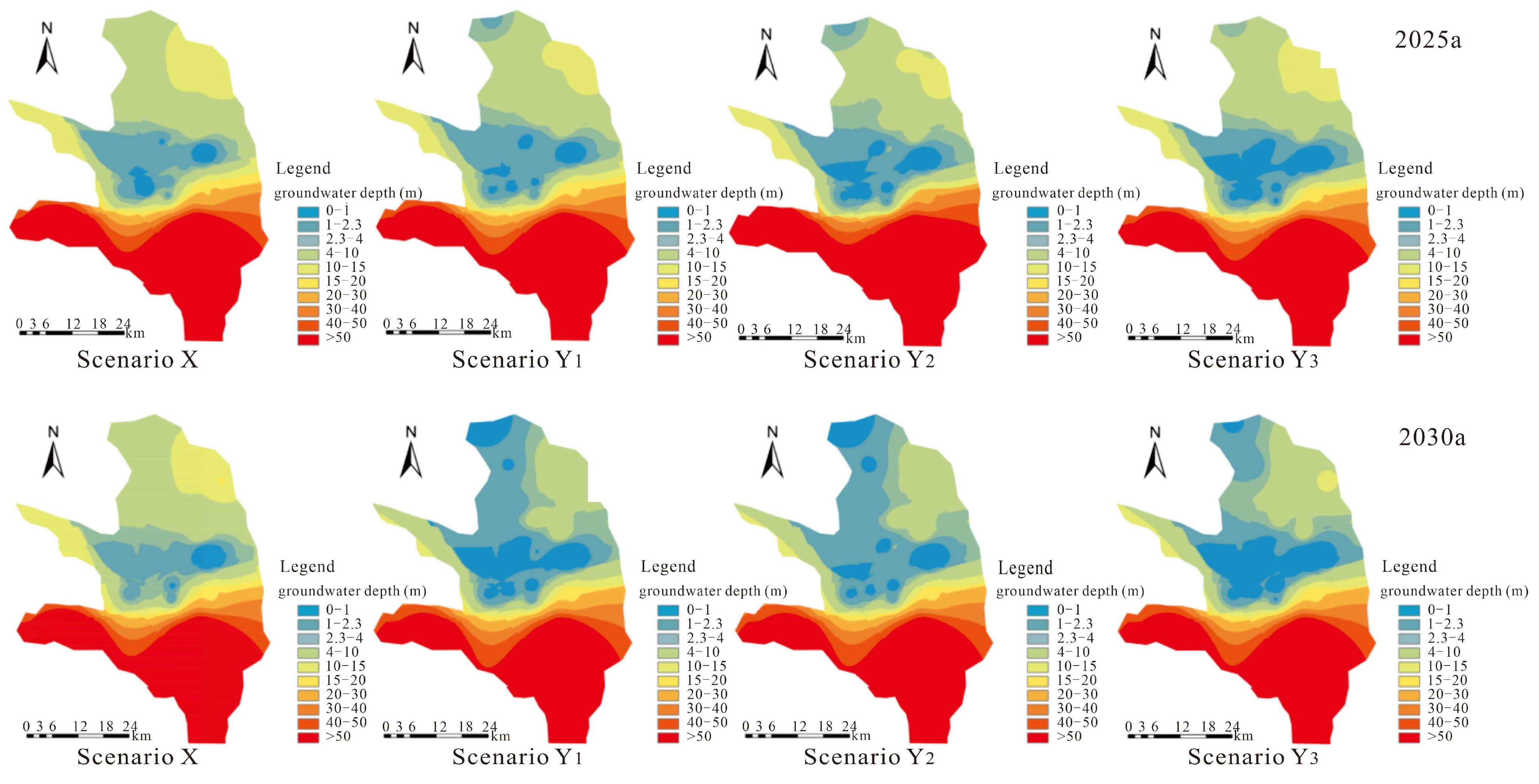 - Under different proportions of water reduction, areas with a comprehensive evaluation value > 0.2 (Y1) have a significant effect on regulating the recovery of groundwater levels, effectively curbing the downward trend of groundwater levels. From a long-term perspective, their regulation of the increase in water levels is better than that of areas with a comprehensive evaluation value > 0.32 (Y2).