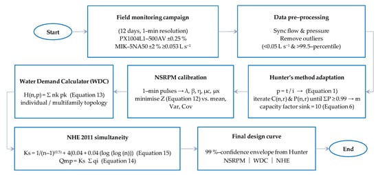 (1) Site selection and sanitary infrastructure inventory in five academic facilities in Loja, Ecuador; (2) High-resolution field monitoring of flow (1 min intervals, ≥0.053 L s−1, ±2% accuracy) and pressure (4 s to 1 min intervals, ±0.25% accuracy) over 12 days per meter; (3) Data pre-processing, including time-series synchronization and outlier removal (values <0.05 L s−1 or above the 99.5th percentile); (4) Probabilistic adaptation of Hunter’s method through temporal disaggregation of usage parameters (i, t, h), binomial probability calibration (ΣP ≥ 0.99), and assignment of capacity factors (sink = 10); (5) Calibration of the NSRPM stochastic model via moment-matching (mean, variance, covariance) and minimization of the objective function Z; (6) Implementation of reference models, including the Water Demand Calculator (WDC) and Ecuador’s NHE 2011 standard (simultaneity factor Ks); and (7) Comparative validation and synthesis of peak flow estimates, culminating in a 99% confidence design envelope that integrates results from all approaches.