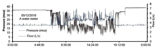 The flow rate record was performed at one-minute intervals, for an average of 12 days for each water meter. Network pressures were recorded in shorter periods, varying from 4 s to 1 min, depending on the memory availability on the computer, in an average of 12 days per pressure data logger.