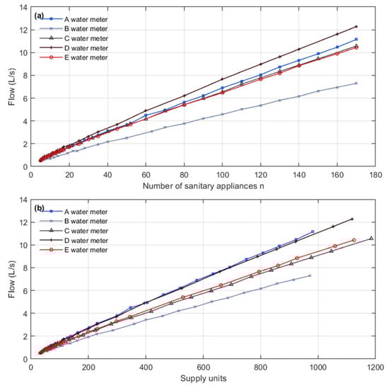 To plot consumption based on source units, the highest consumption for individual flow appliance was assigned a factor of 10, as suggested in [,]. Considering the flow of each existing appliance, Equation (6) was used to obtain the different source units per sanitary appliance.